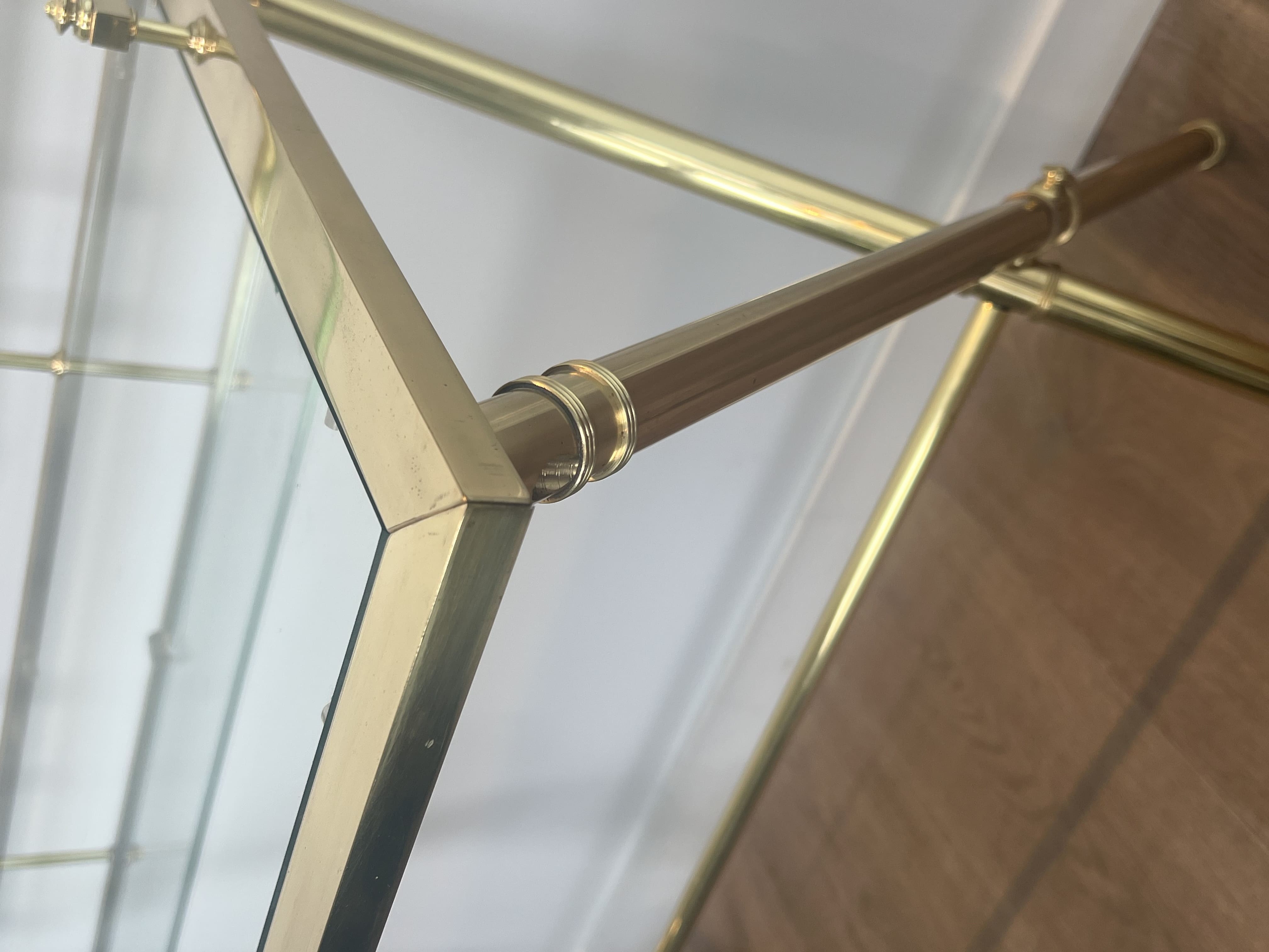 The rigor of this geometry, drawing directly from the neoclassical and Directoire repertoires while refining it through the use of glass, allows this furniture to be linked to the productions of Maison Jansen. Founded in Paris in 1880, this prestigious firm established itself in the 20th century, under the direction of Stéphane Boudin, as the global benchmark for luxury interior design (furnishing high aristocracy and major embassies). The Parisian house made this type of brass and glass occasional furniture an unmistakable signature to satisfy the demand for bright, sophisticated interiors affiliated with the Hollywood Regency movement.
