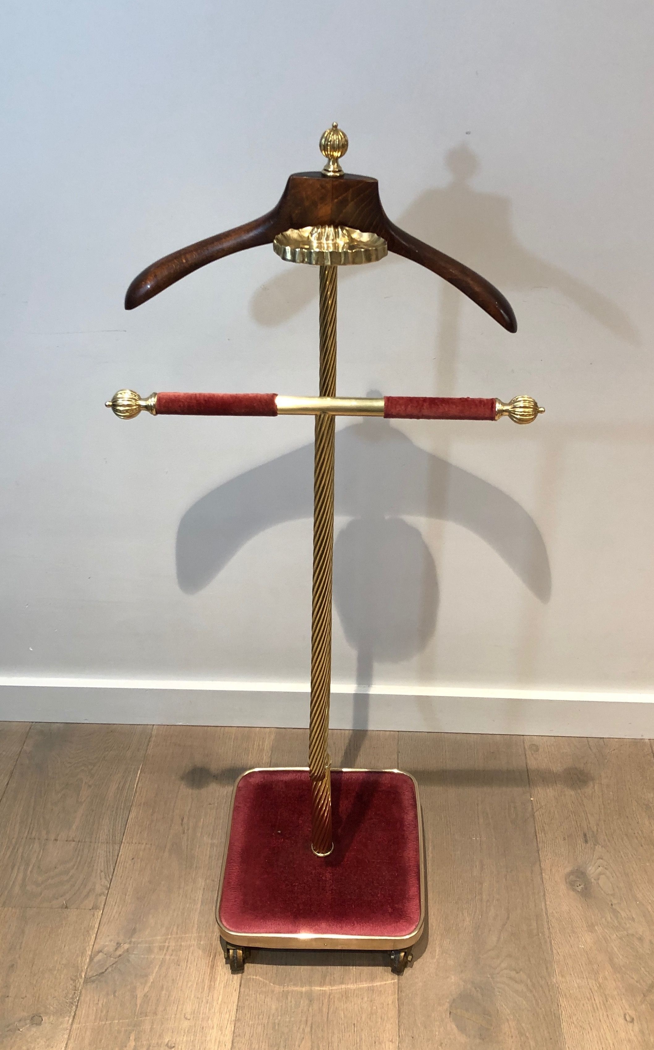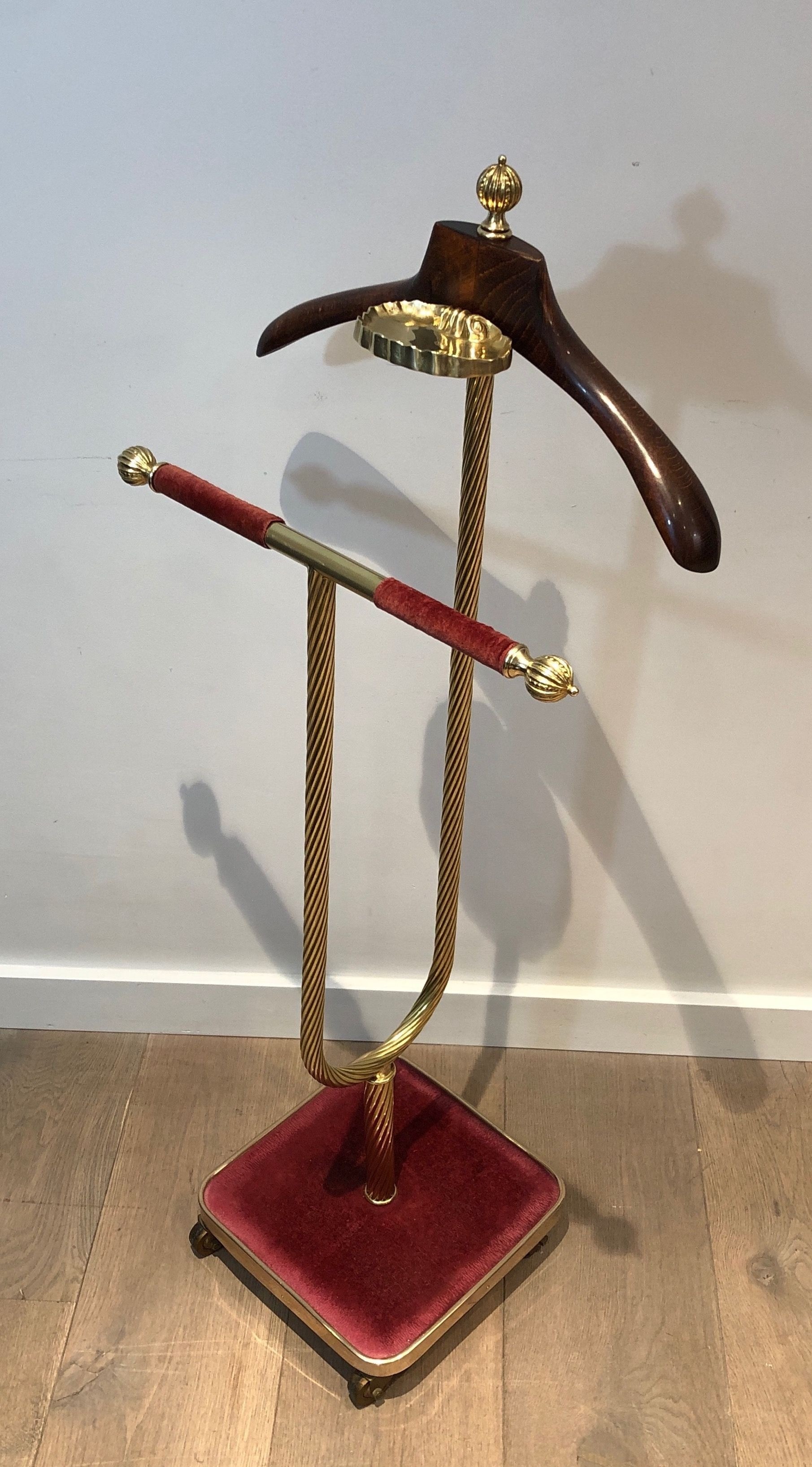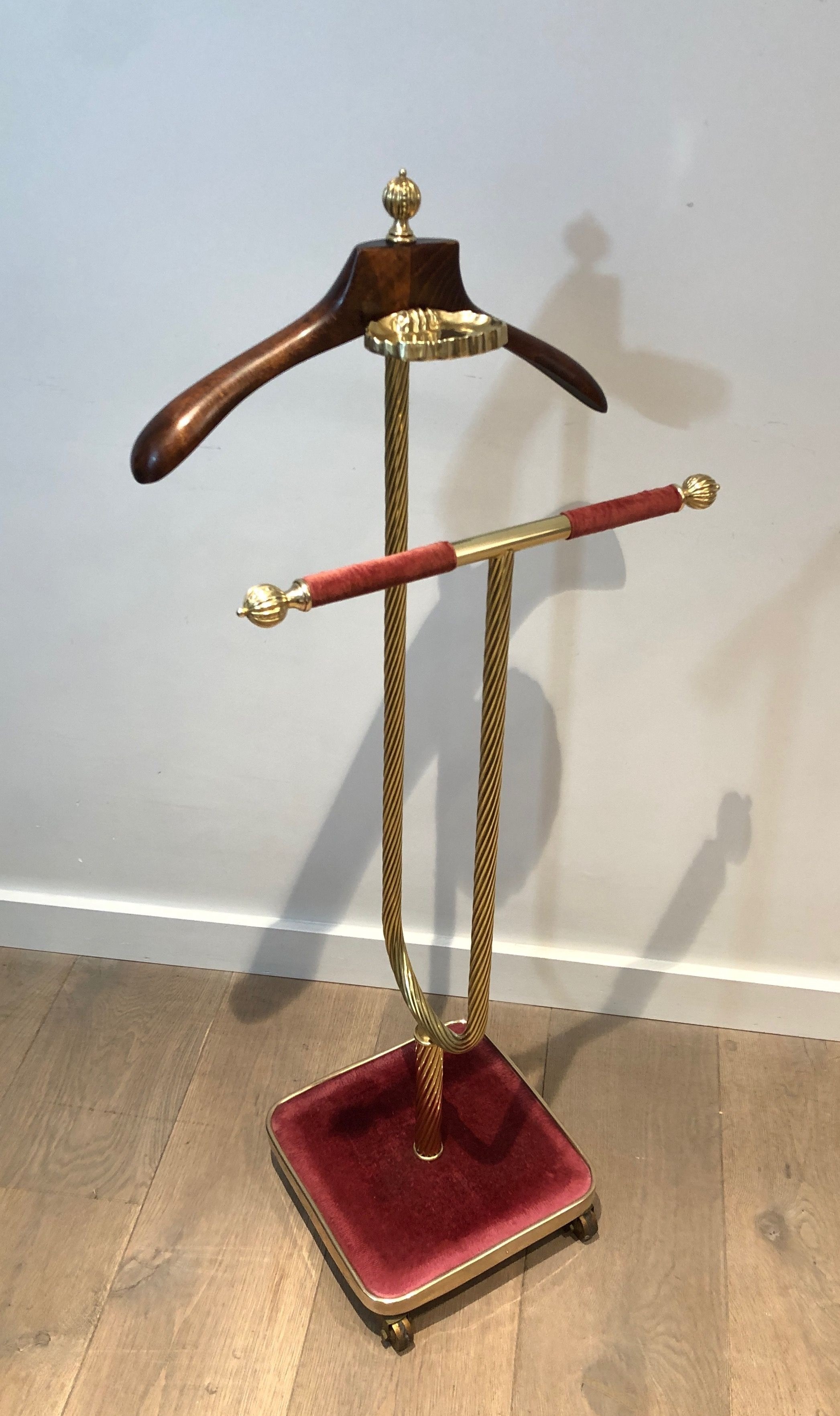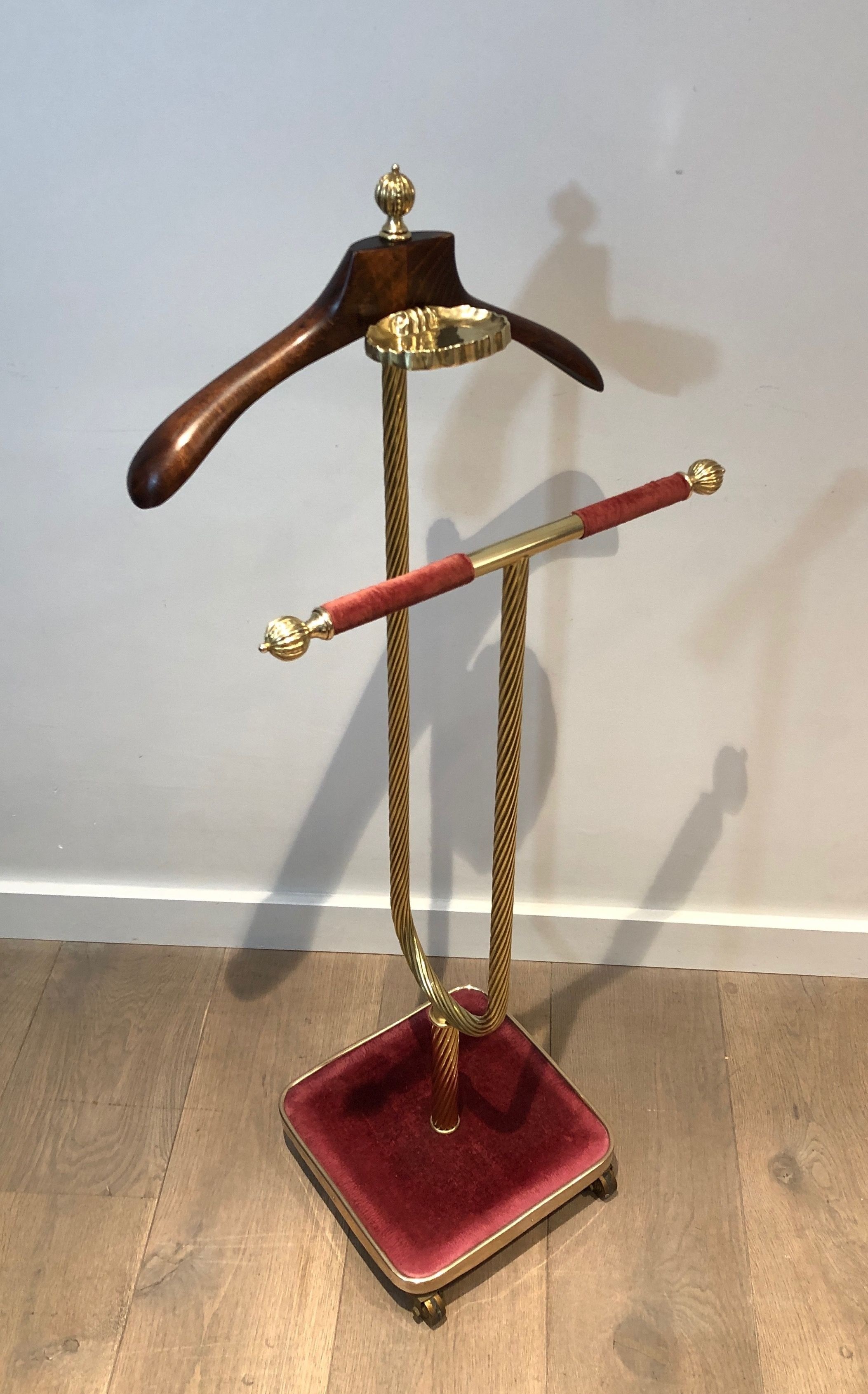 This valet stand is attributed to Maison Jansen, the legendary Parisian decorating house founded in 1880 on the Rue Royale, whose interiors under Stéphane Boudin (1888–1967) set the international standard for luxury domestic decoration in the mid-twentieth century. Small functional objects such as this valet stand were produced by Jansen for the dressing rooms of its grandest private commissions — the bedroom suites of royal palaces, the dressings of the most distinguished Parisian hôtels particuliers. In Boudin's vision, every object in a well-appointed interior, however seemingly minor, was an opportunity to express the house's exacting standards of material quality and formal refinement. A valet stand in brass and crimson velvet bearing the Jansen imprimatur represents that philosophy at its most intimate and complete.