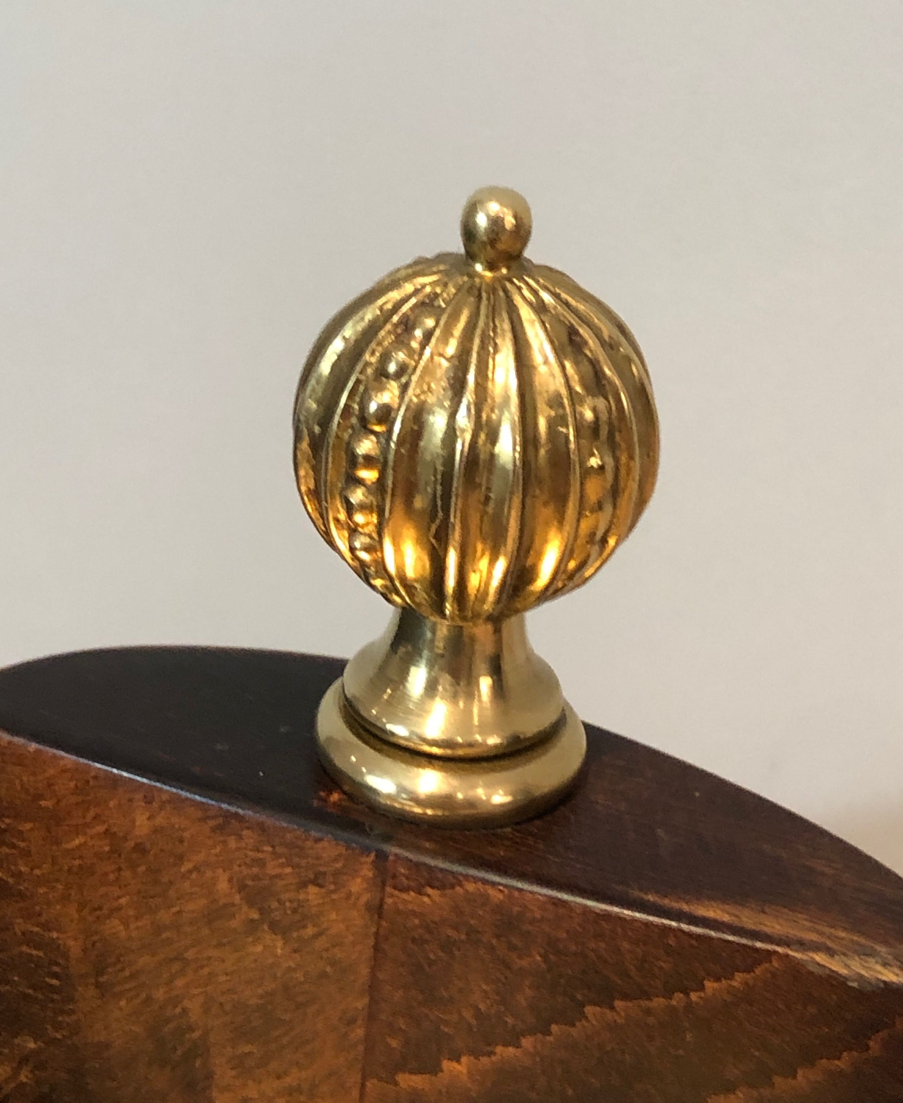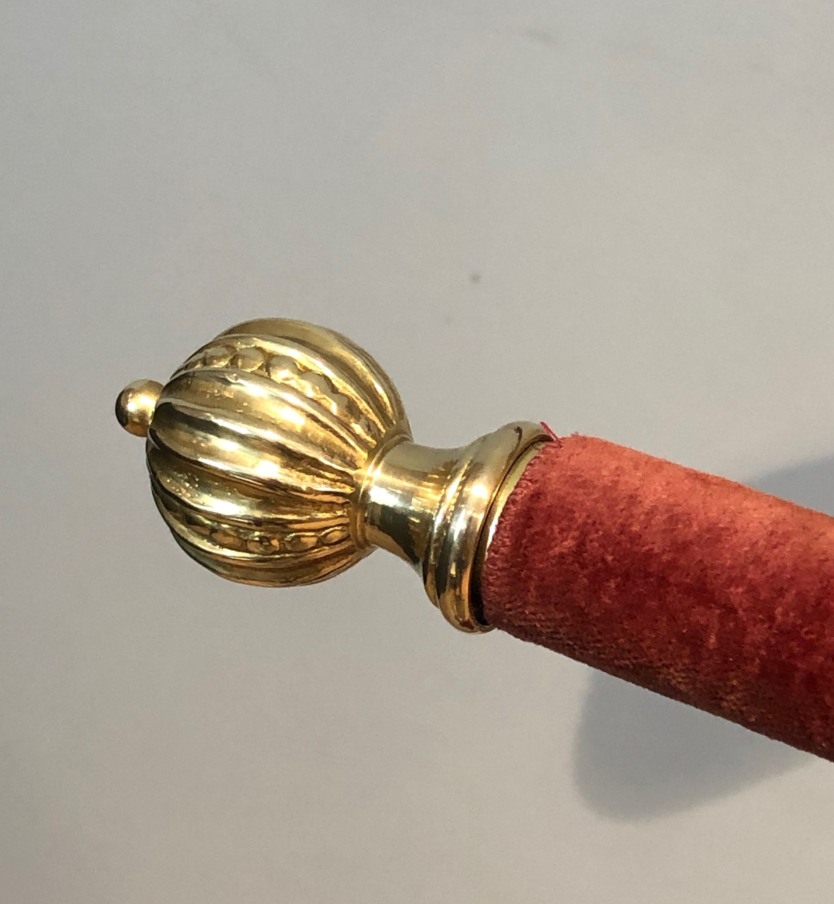 This exceptional valet stand combines a structure in polished brass of neoclassical inspiration with surfaces in crimson red velvet, the juxtaposition of gleaming metal and sumptuous textile producing an ensemble of concentrated luxury characteristic of Maison Jansen's most refined domestic objects. The brass framework, with its architectural clarity and classical detailing, provides the structural logic of the piece, while the red velvet — applied to the padded surfaces where garments will rest — ensures that every jacket, every suit, every accessory is received with the attentiveness of a professional valet. The combination of brass and scarlet velvet is among the most dramatic in the French decorative vocabulary: warm, opulent, and wholly confident in its chromatic assertiveness.