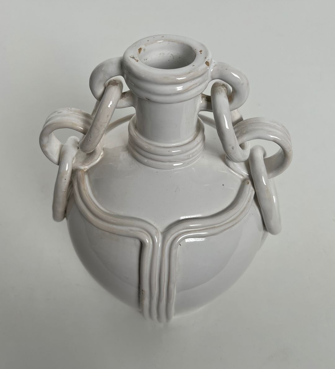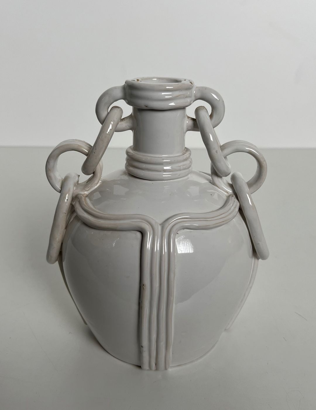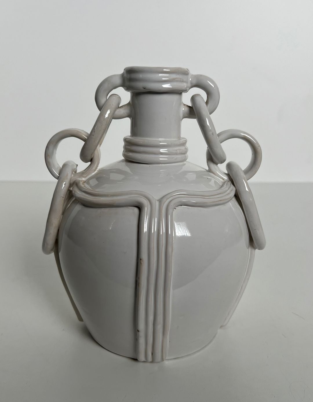 Elegant ceramic vase covered in a warm white opaque glaze, with a ribbed amphora body and distinctive decorative chain-link loop handles suspended between the neck and shoulders. Signed on the base. French work, circa 1970. W. 20.5 × D. 18.5 × H. 24.5 cm.