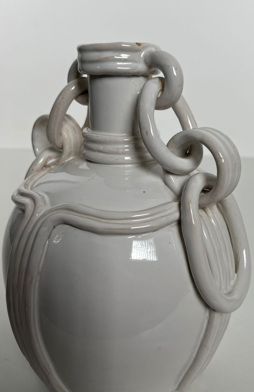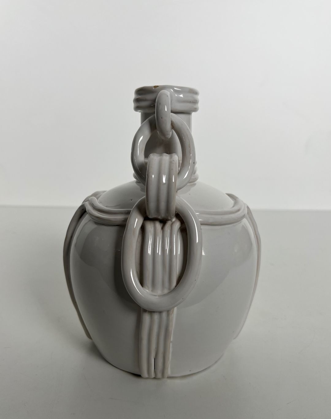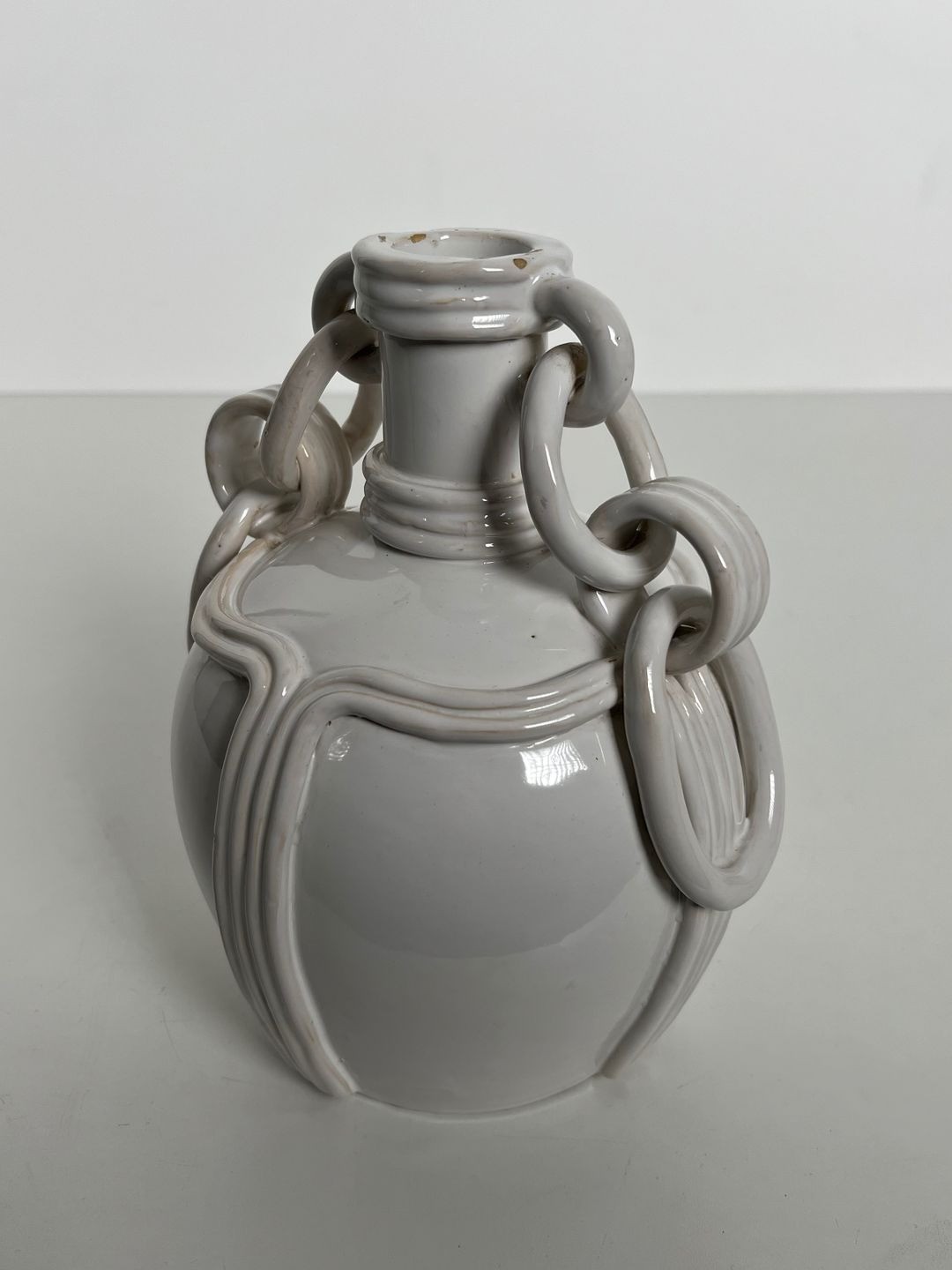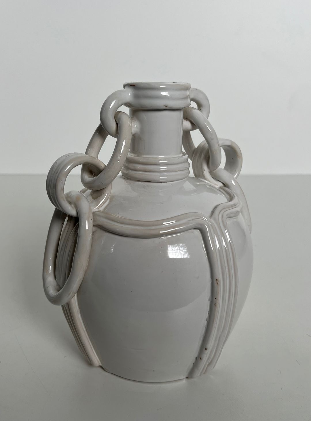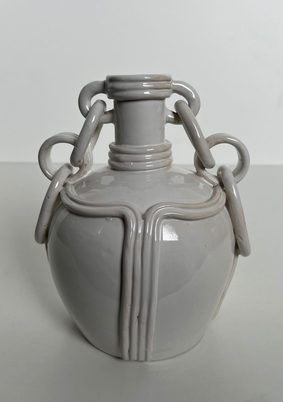 This refined ceramic vase is a piece of considerable originality, notable above all for its distinctive decorative handles: interlocking ceramic rings forming chain-like loops that hang loosely between the neck and the shoulder of the vessel. The device — which requires considerable skill and patience in the making, as the rings must be formed and attached while the clay is still workable, yet fired integrally with the rest of the piece — gives the vase a playful, sculptural quality that elevates it well above the merely functional. The chains sway gently when the vase is moved, adding a kinetic dimension to an otherwise static object.