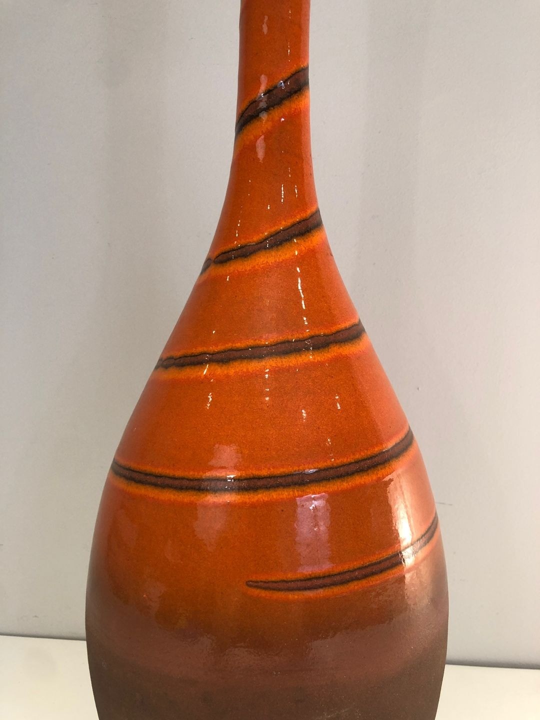 Tall ceramic vase with a dramatic narrow-waisted form, glazed in rich terracotta-orange with dark brown horizontal banding, French, circa 1950. W. 19 × D. 19 × H. 60 cm.