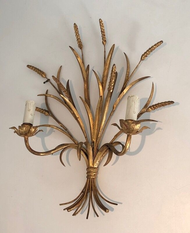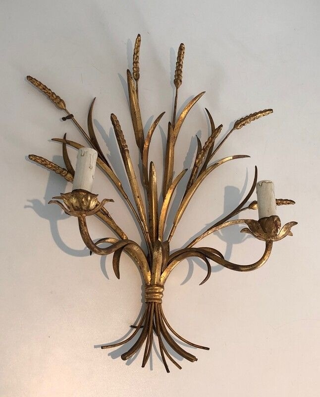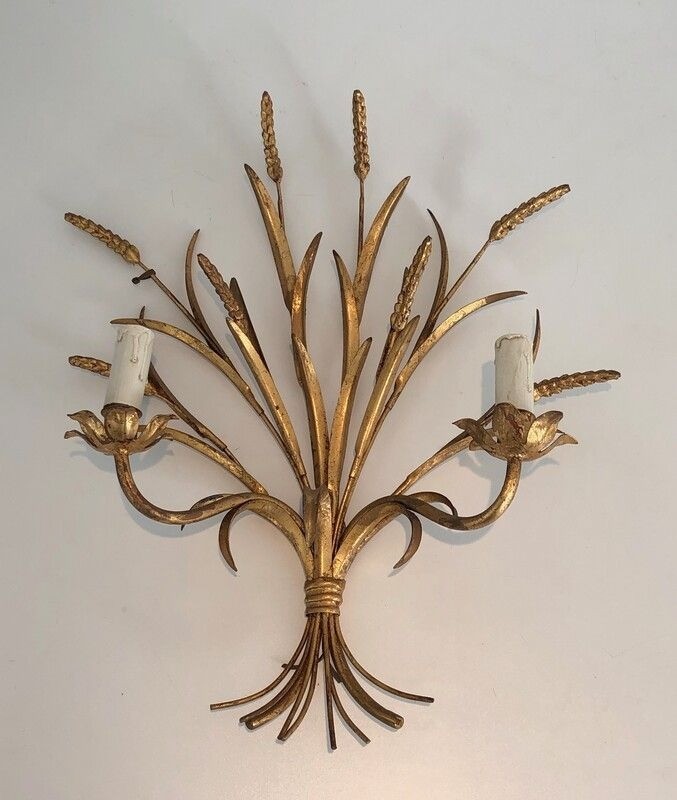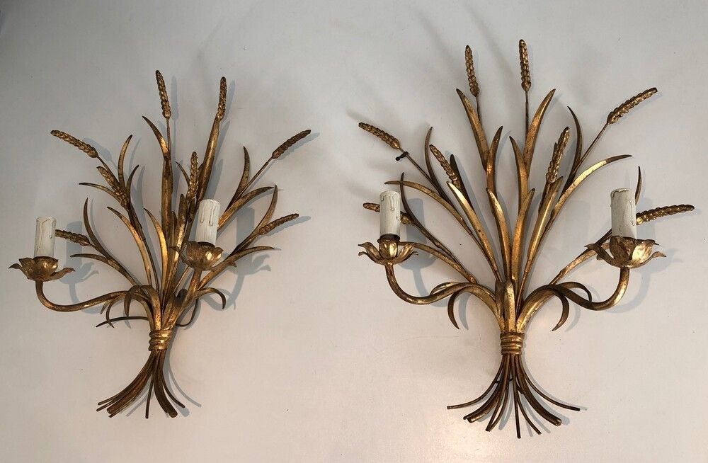 Coco Channel Large Pair of Gilt Metal Ears of Wheat Wall Sconces. French. Circa 1970