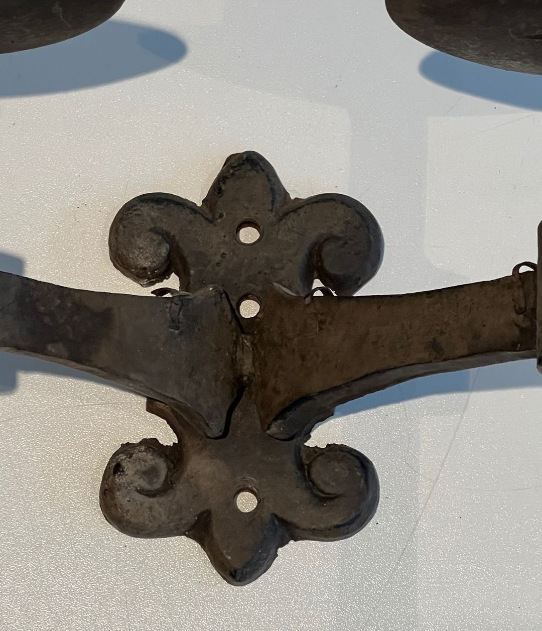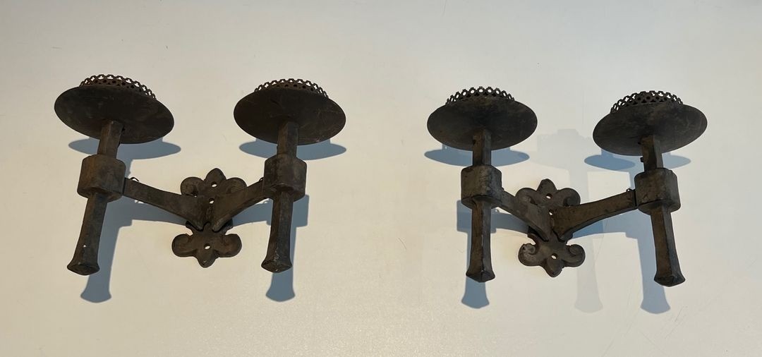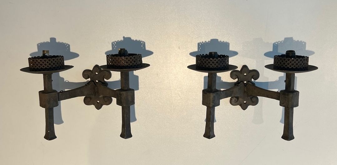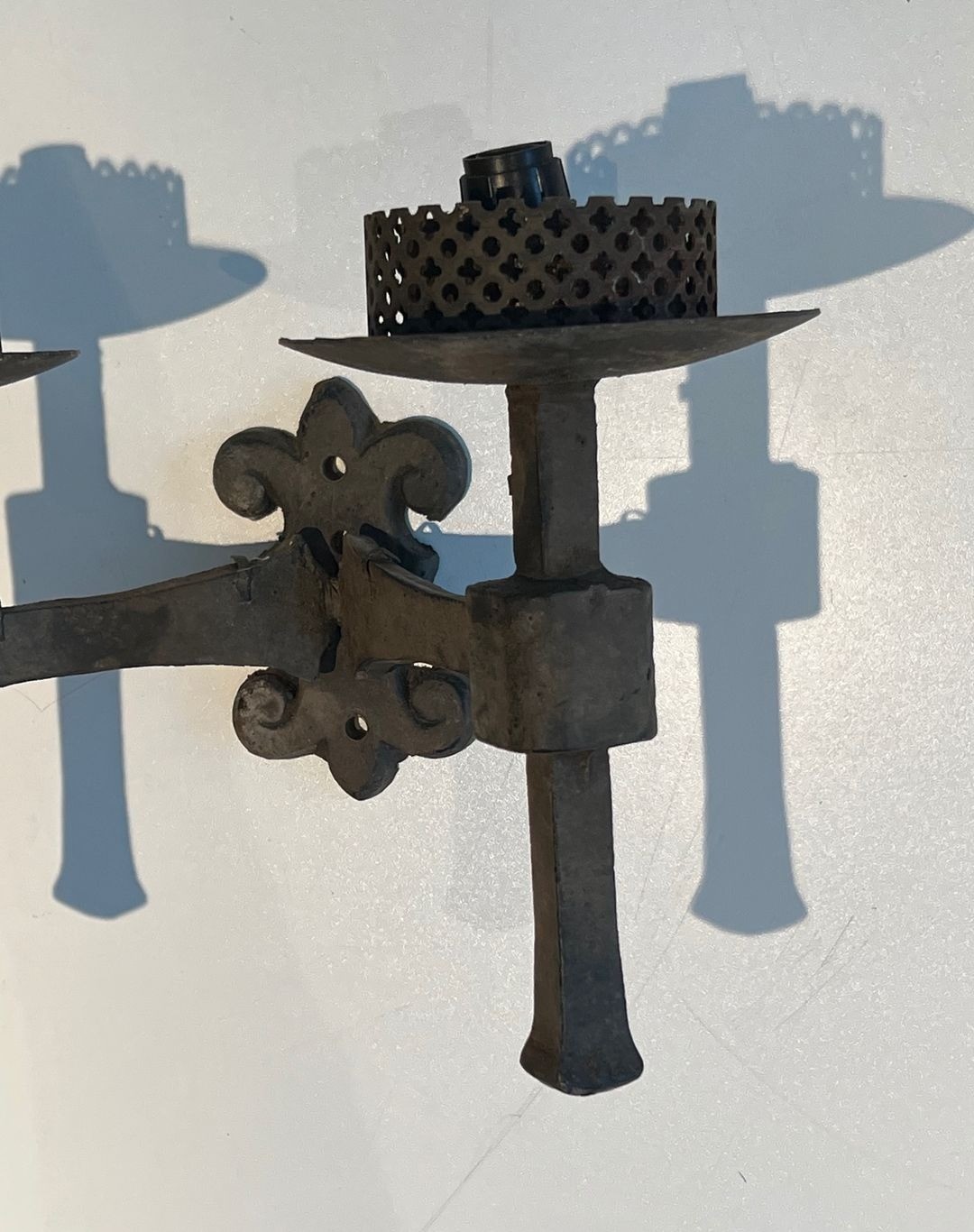 Pair of wrought iron wall lights with 2 Arms. French work in the Gothic Style. Circa 1940