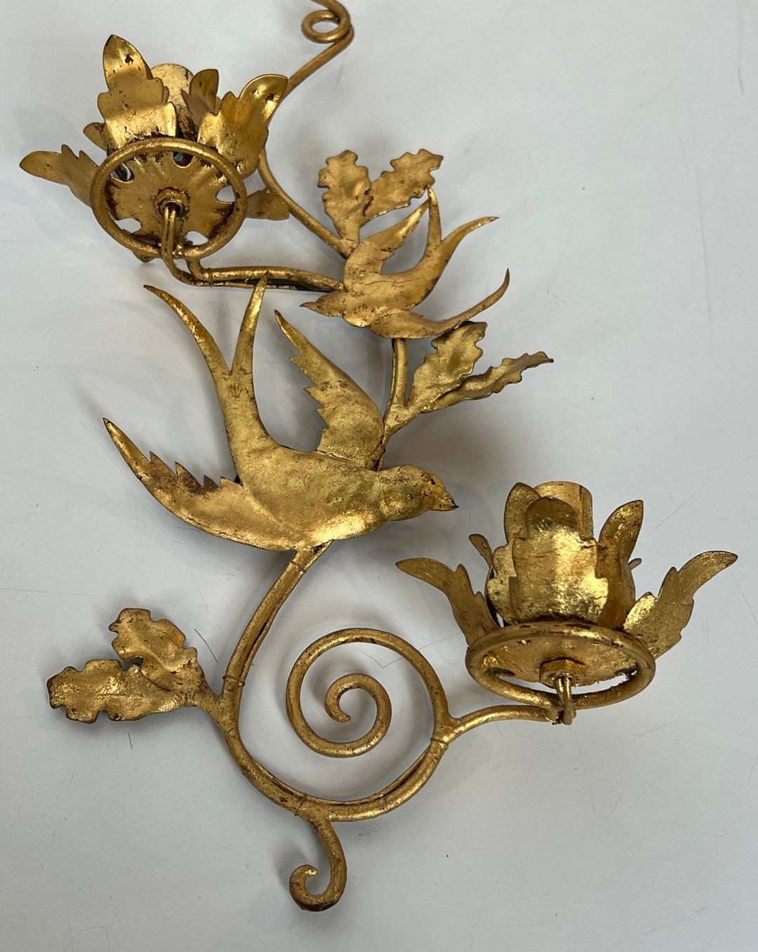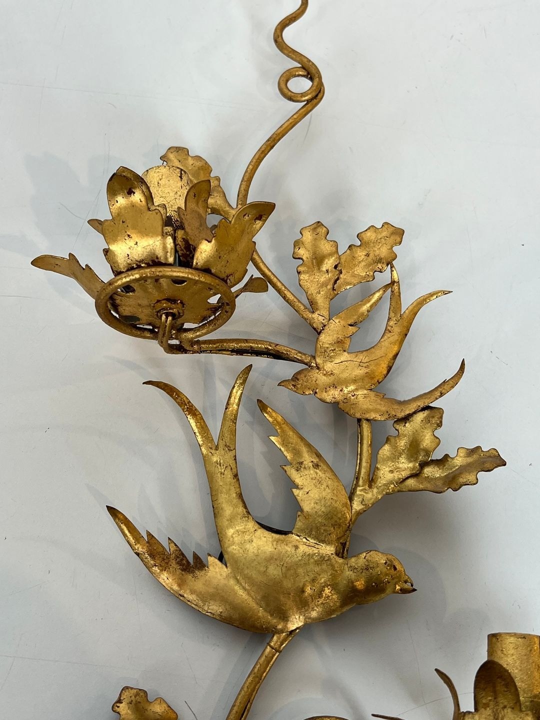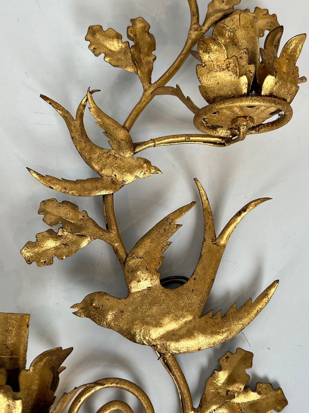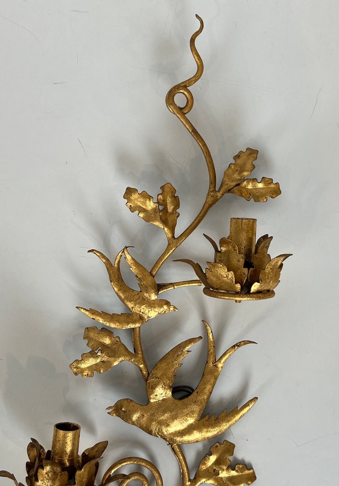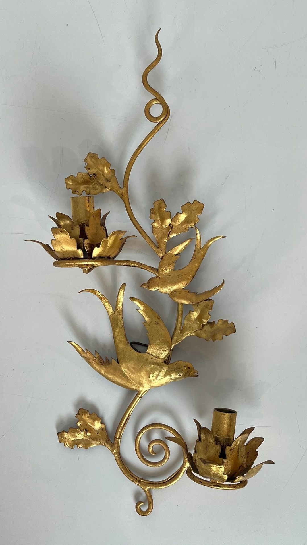 These elegant gilded wall sconces present birds as the animating motif, each applique composed around gilded birds perched on sinuous branches that serve as the structural arms from which the light fittings issue. The warm gilt finish and naturalistic composition achieve the distinctive effect associated with the finest French decorative metalwork of this type: organic and opulent at once, the birds lending the pieces a vitality and narrative charm that purely geometric designs cannot match. At 51.5 cm in height, they make a striking impression on the wall. Dating from circa 1970, they are executed in the taste of Maison Baguès, the celebrated Parisian house synonymous with this genre of naturalistic gilt lighting.
