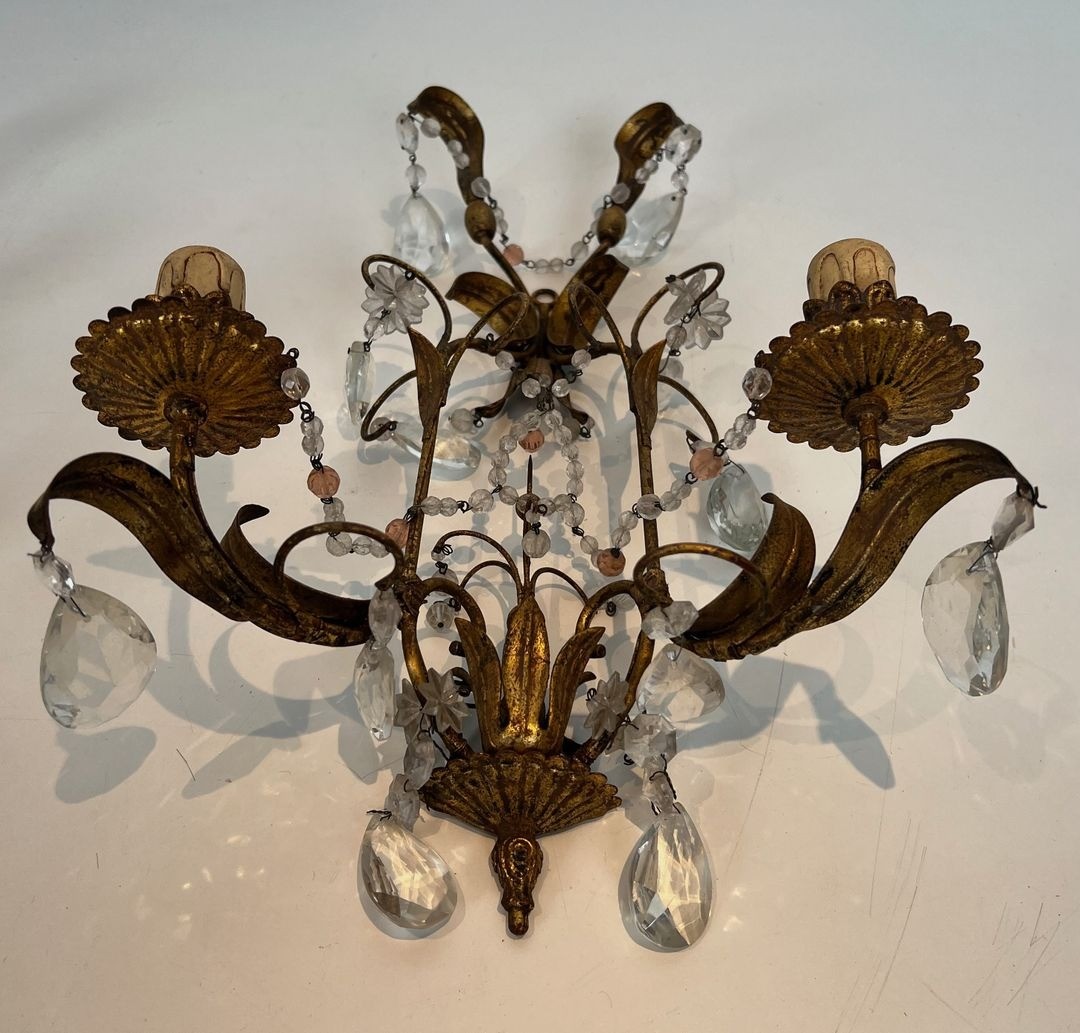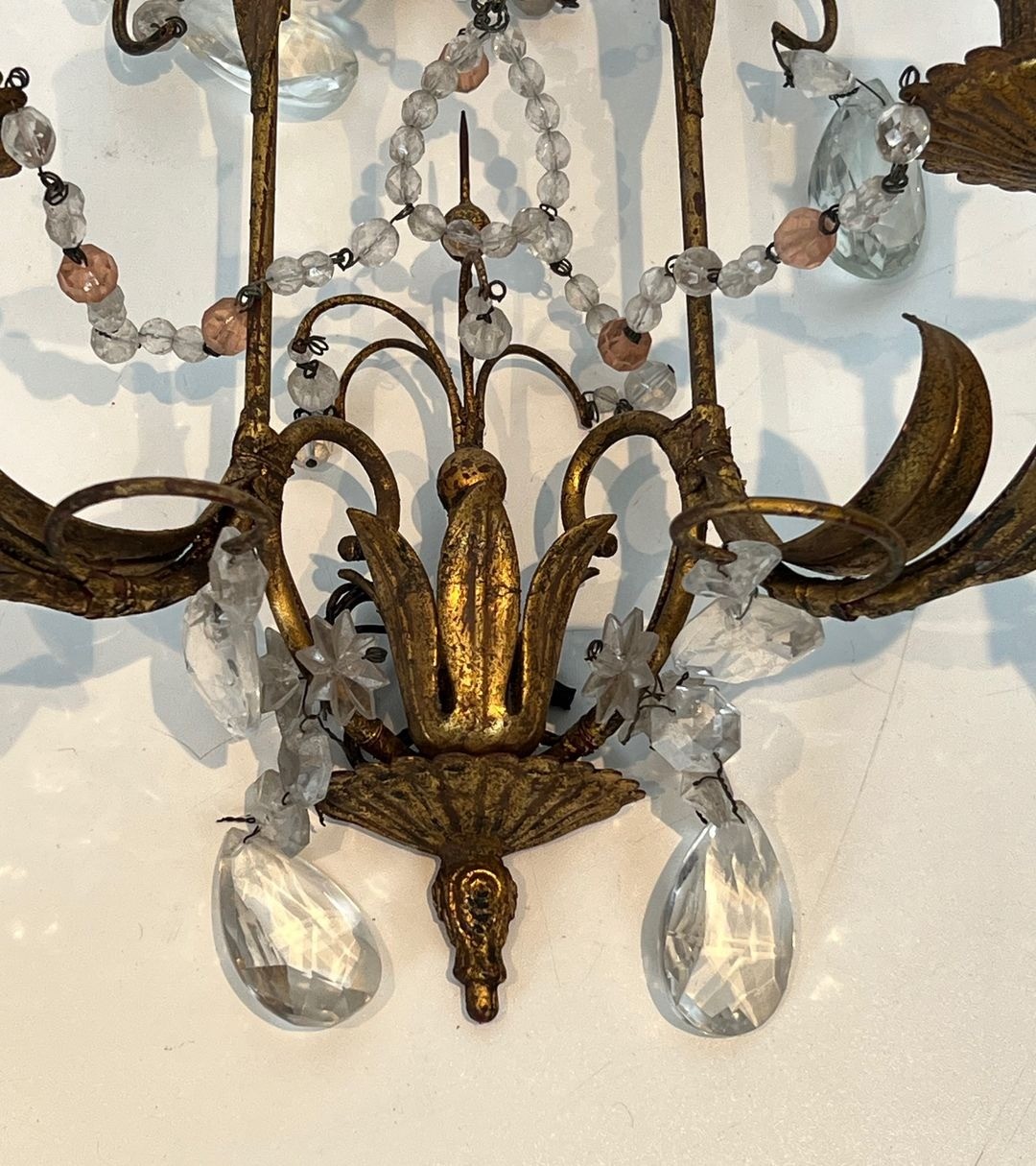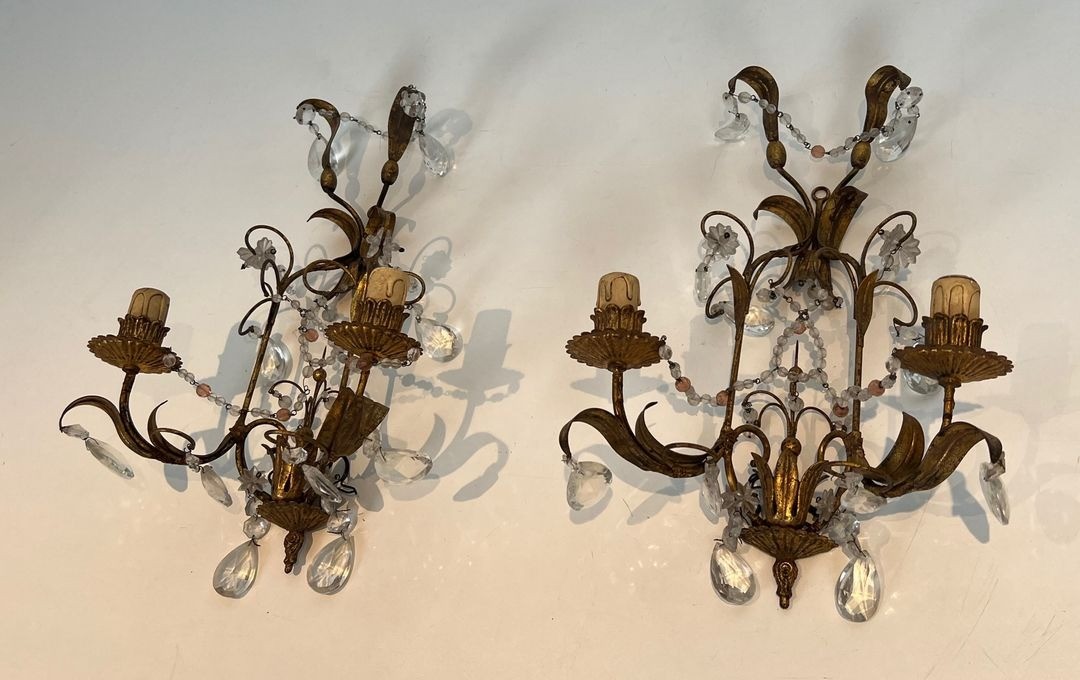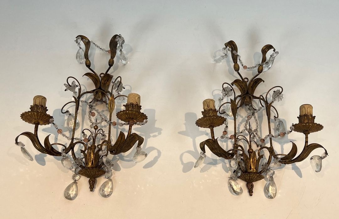 Pair of gilded metal and crystals wall sconces. French work in the style of Maison Baguès
