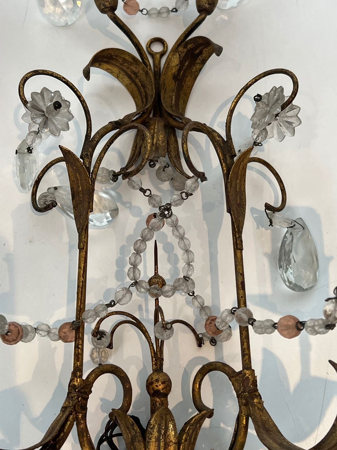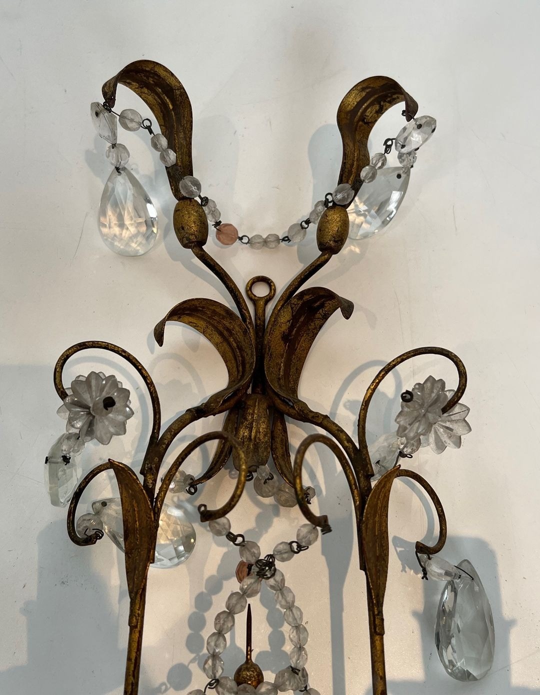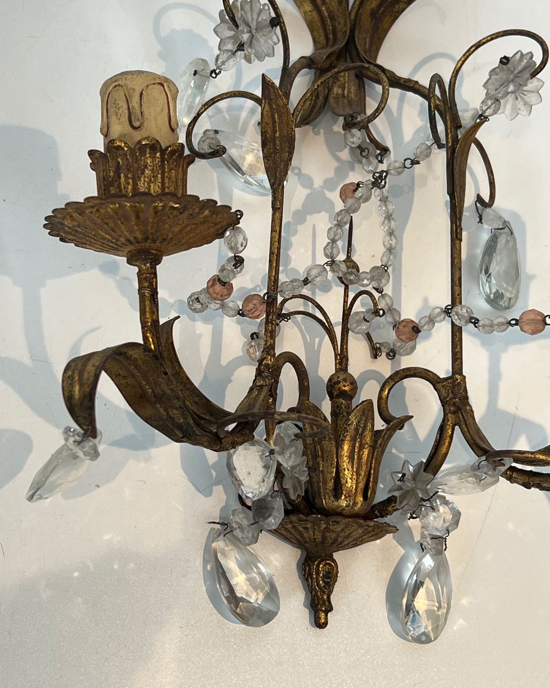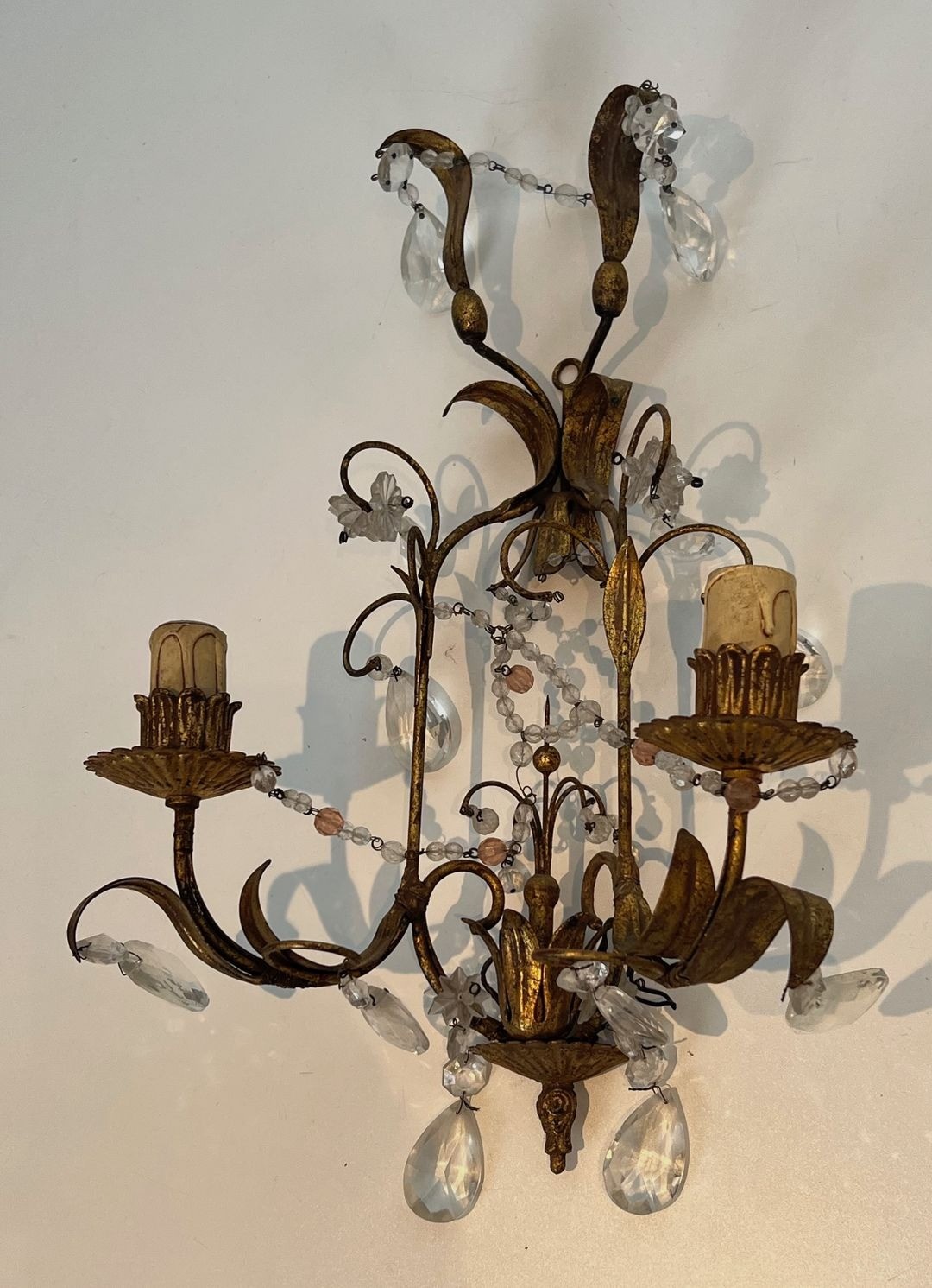 Pair of gilded metal and crystals wall sconces. French work in the style of Maison Baguès