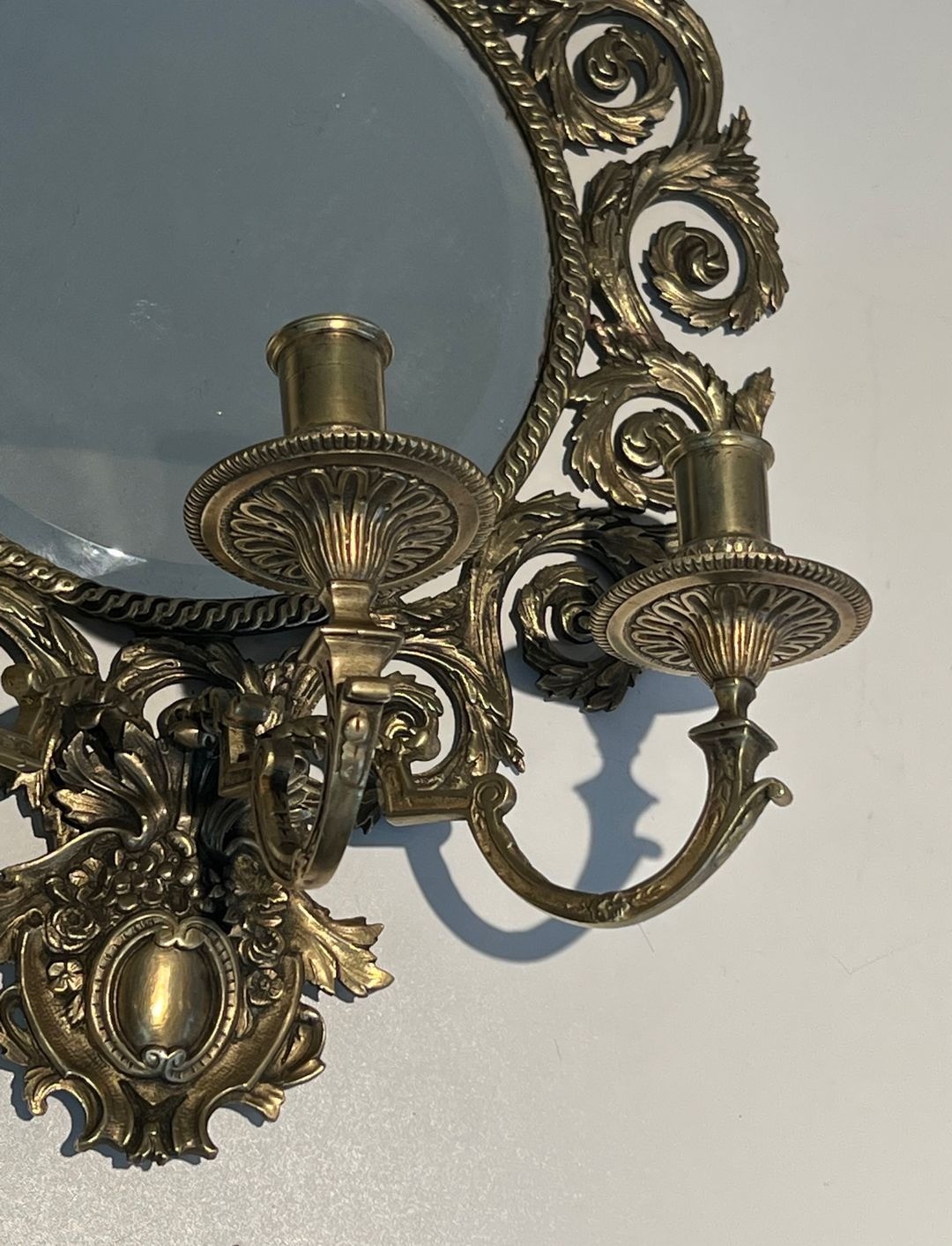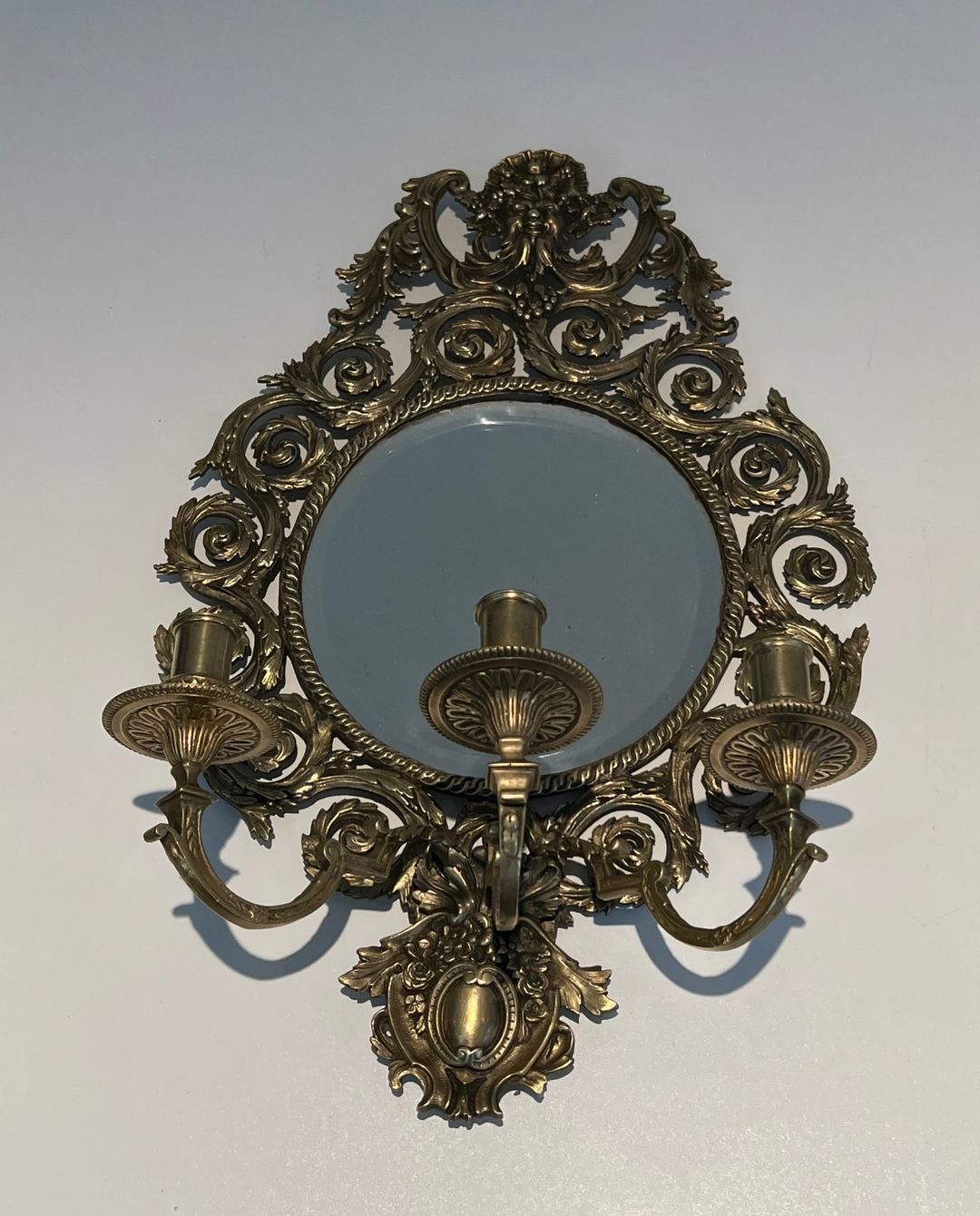 Large pair of 3 arms Louis the 14th chiseled bronze wall Lights with a mirror on its center. French work. 19th century