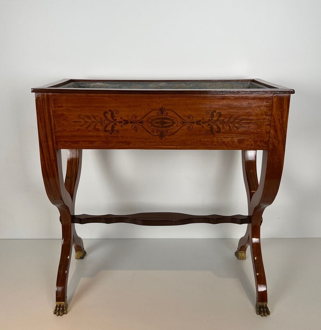 Jardinière en acajou marquetée d'amaranthe présentant un bac en zinc, un piètement en "X" et des pieds griffes en bronze. Travail Français d'époque Charles X. Vers 1830