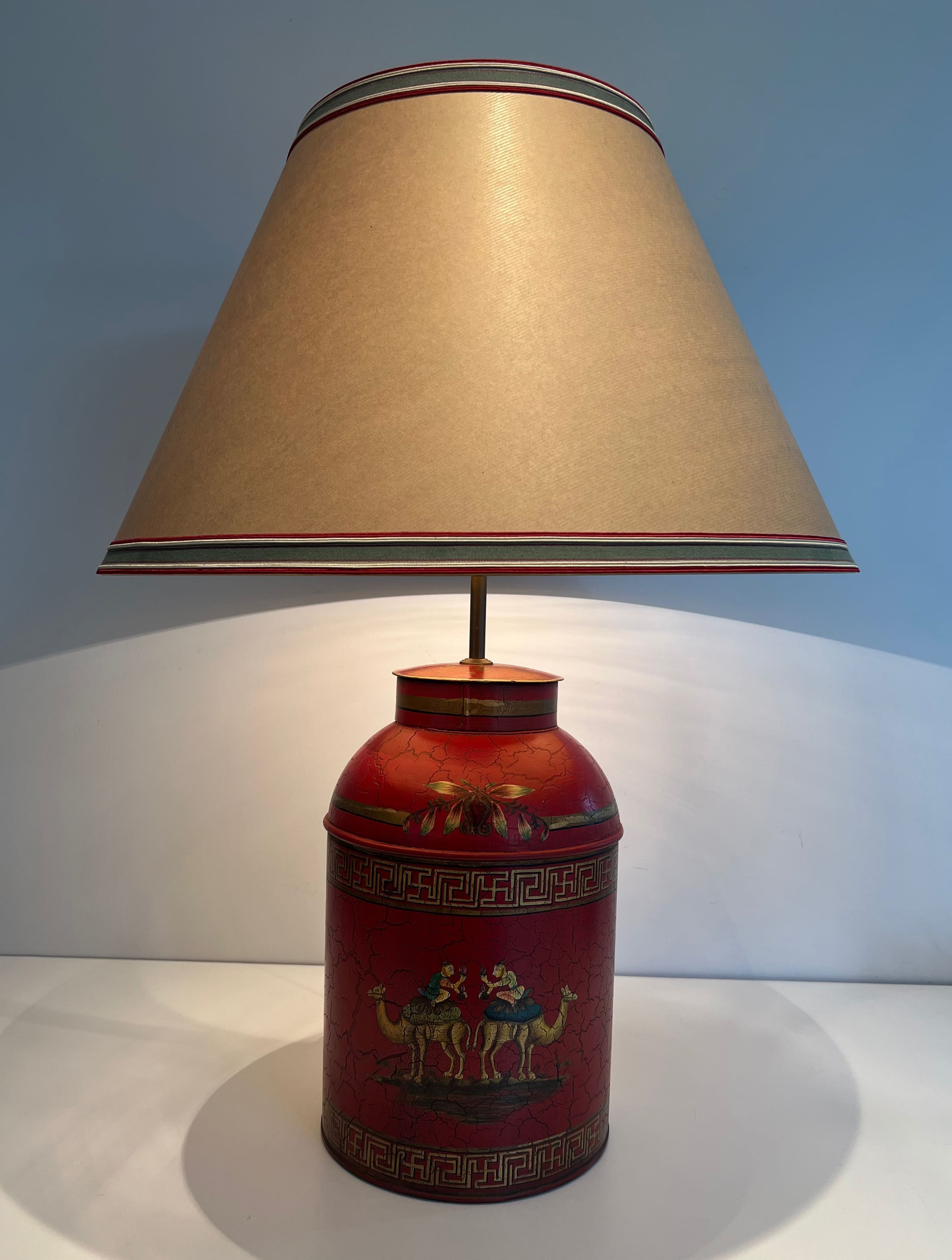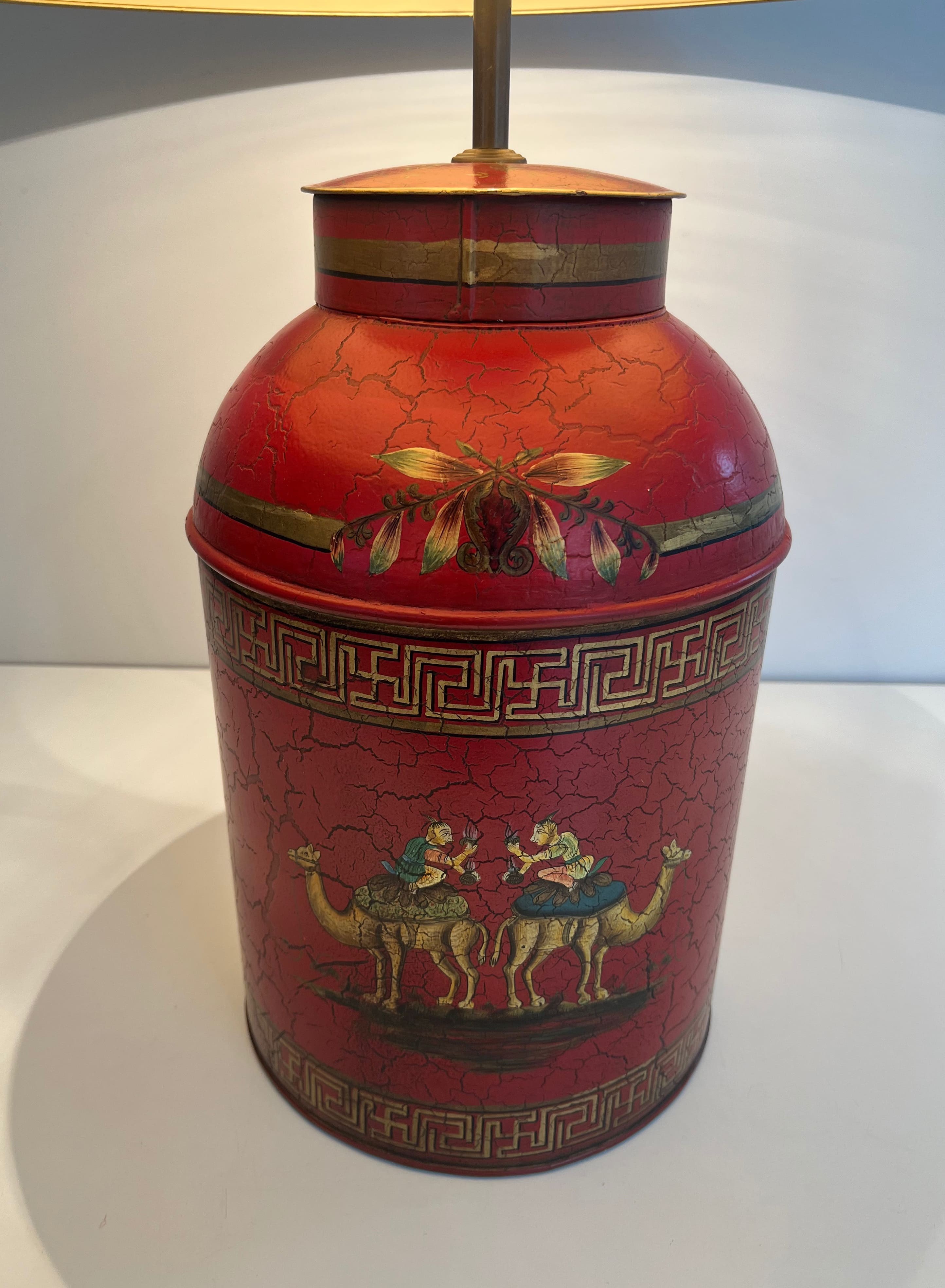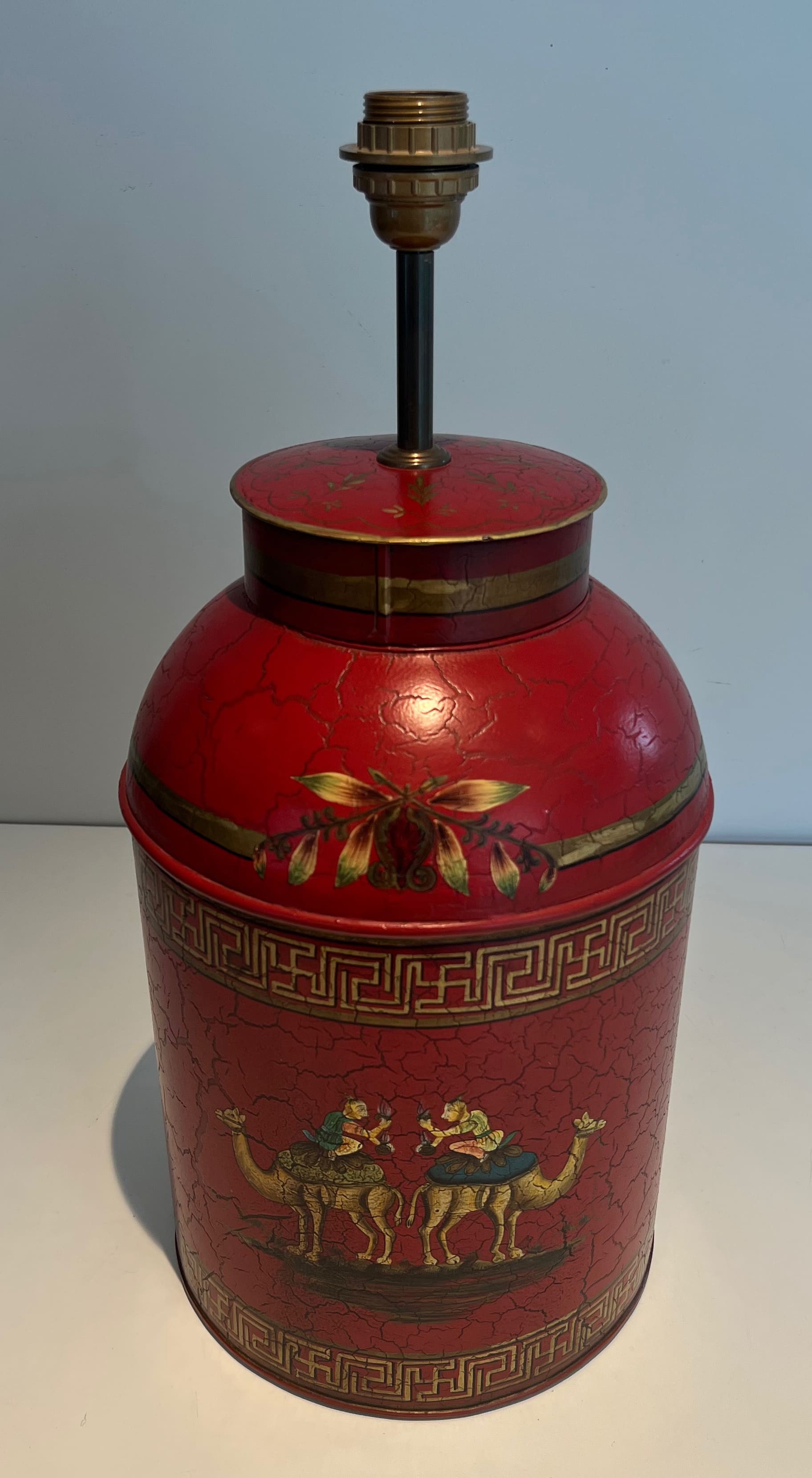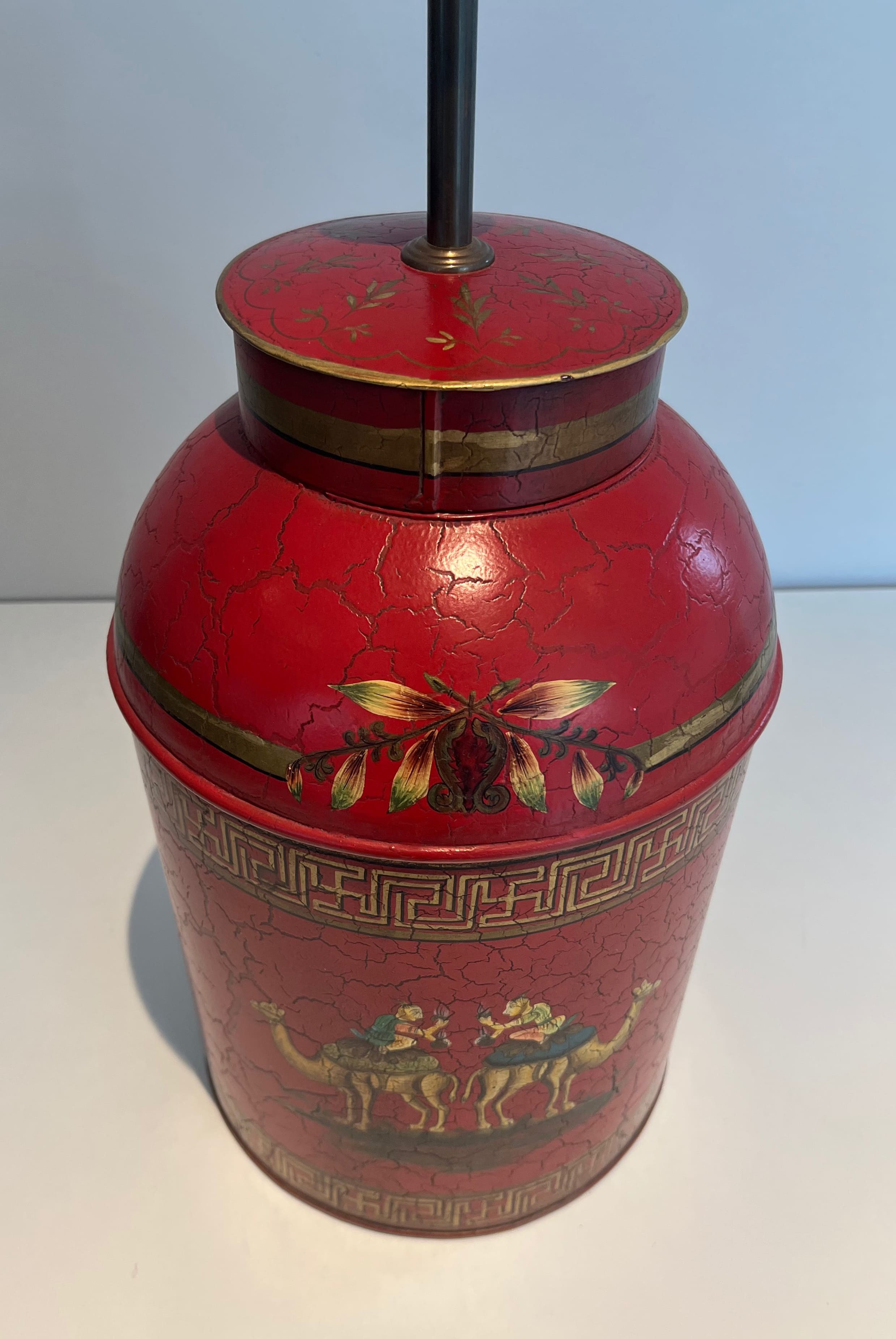 Ce luminaire repose sur le détournement élégant d'un objet utilitaire, une pratique classique de la haute décoration du XXe siècle. La base de la lampe est constituée d'une boîte cylindrique à épaulement courbe en tôle peinte, reprenant la typologie stricte des anciennes boîtes à thé servant à l'importation. La surface métallique est recouverte d'un fond rouge vif présentant un réseau de craquelures artificielles, une technique employée pour simuler l'ancienneté et l'aspect des laques asiatiques. Le corps est animé d'un décor de Chinoiseries peint à la main, figurant des personnages orientaux chevauchant des chameaux, encadré par de rigoureuses frises de grecques et surmonté de motifs floraux.