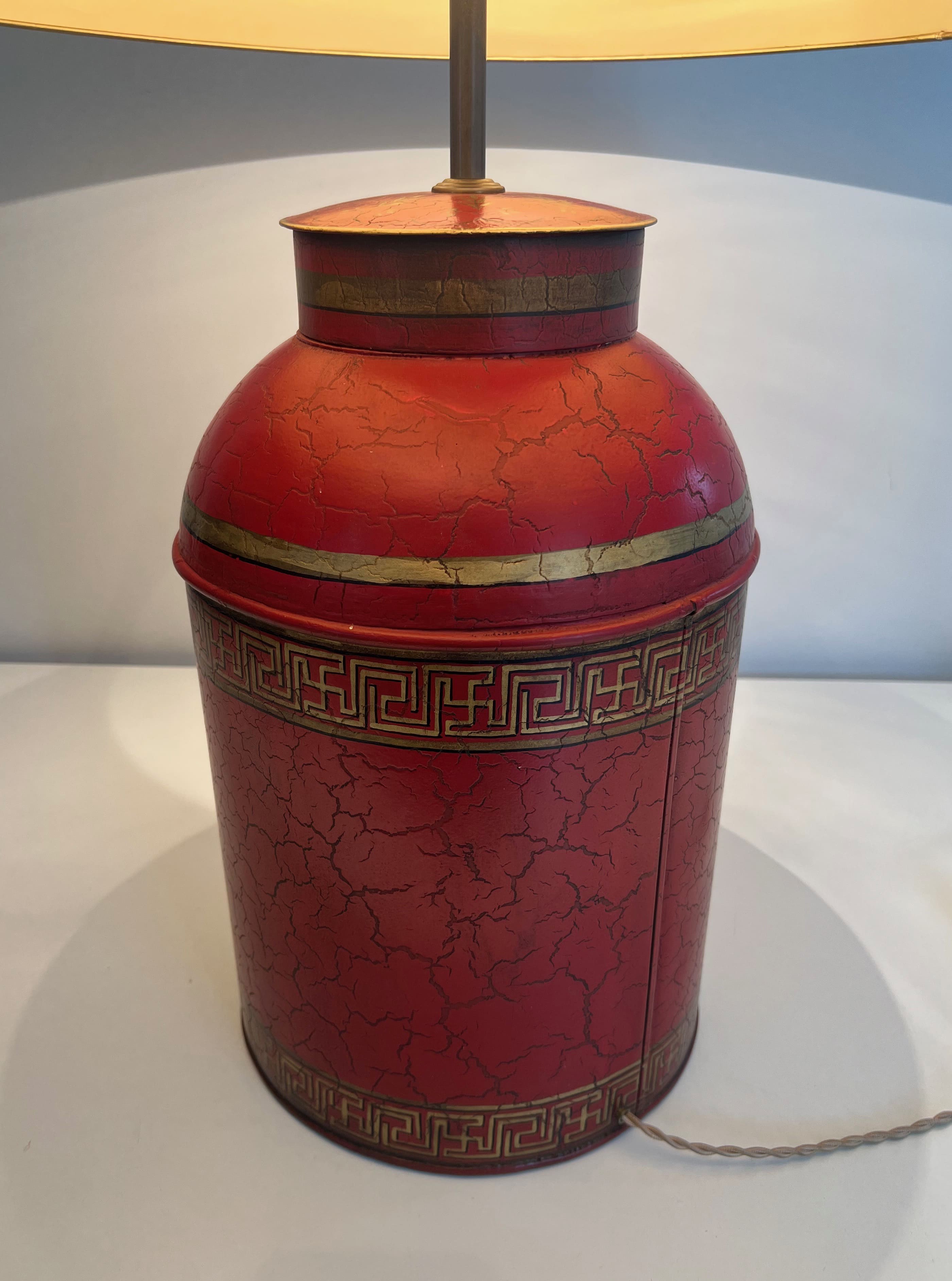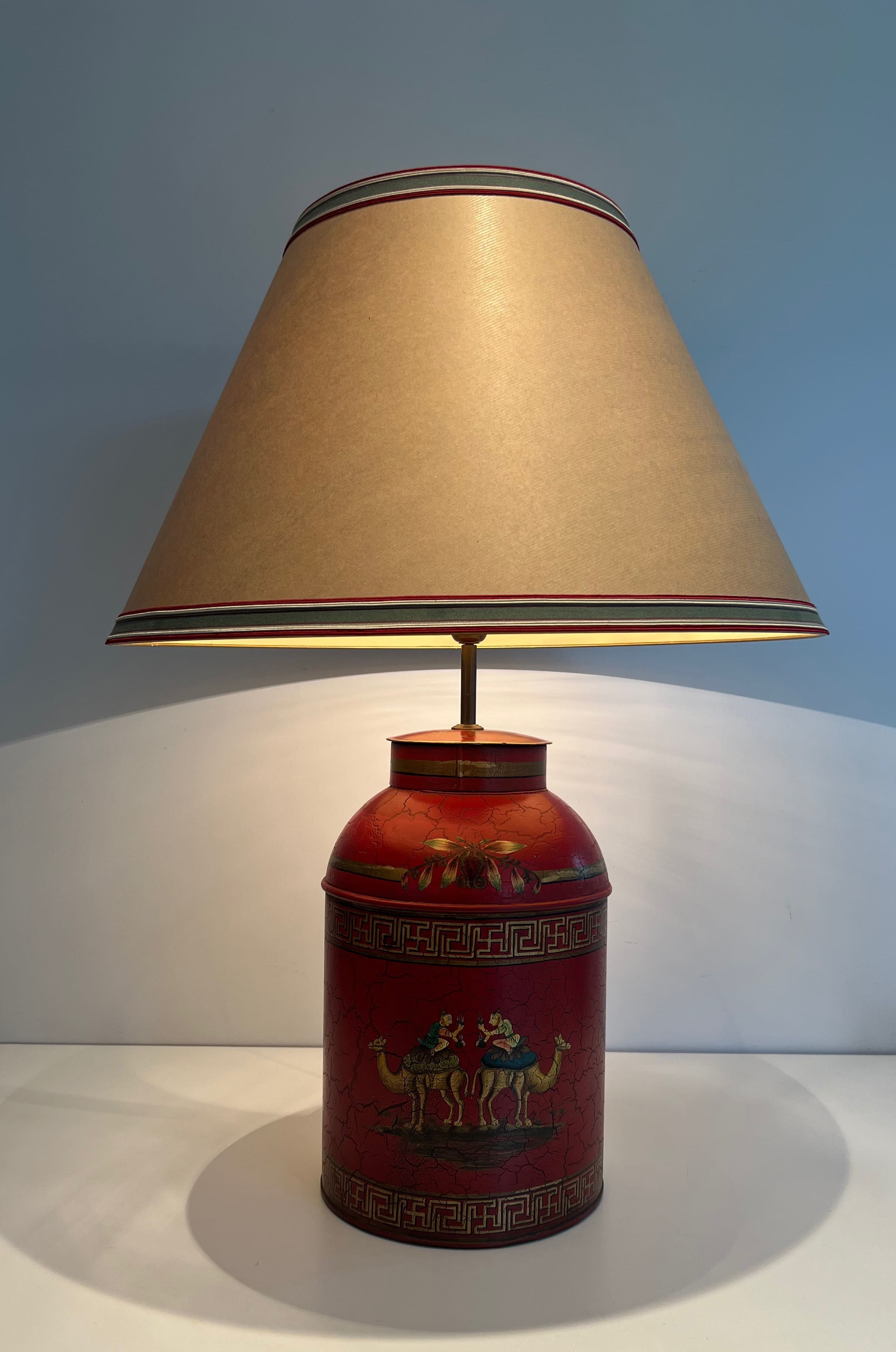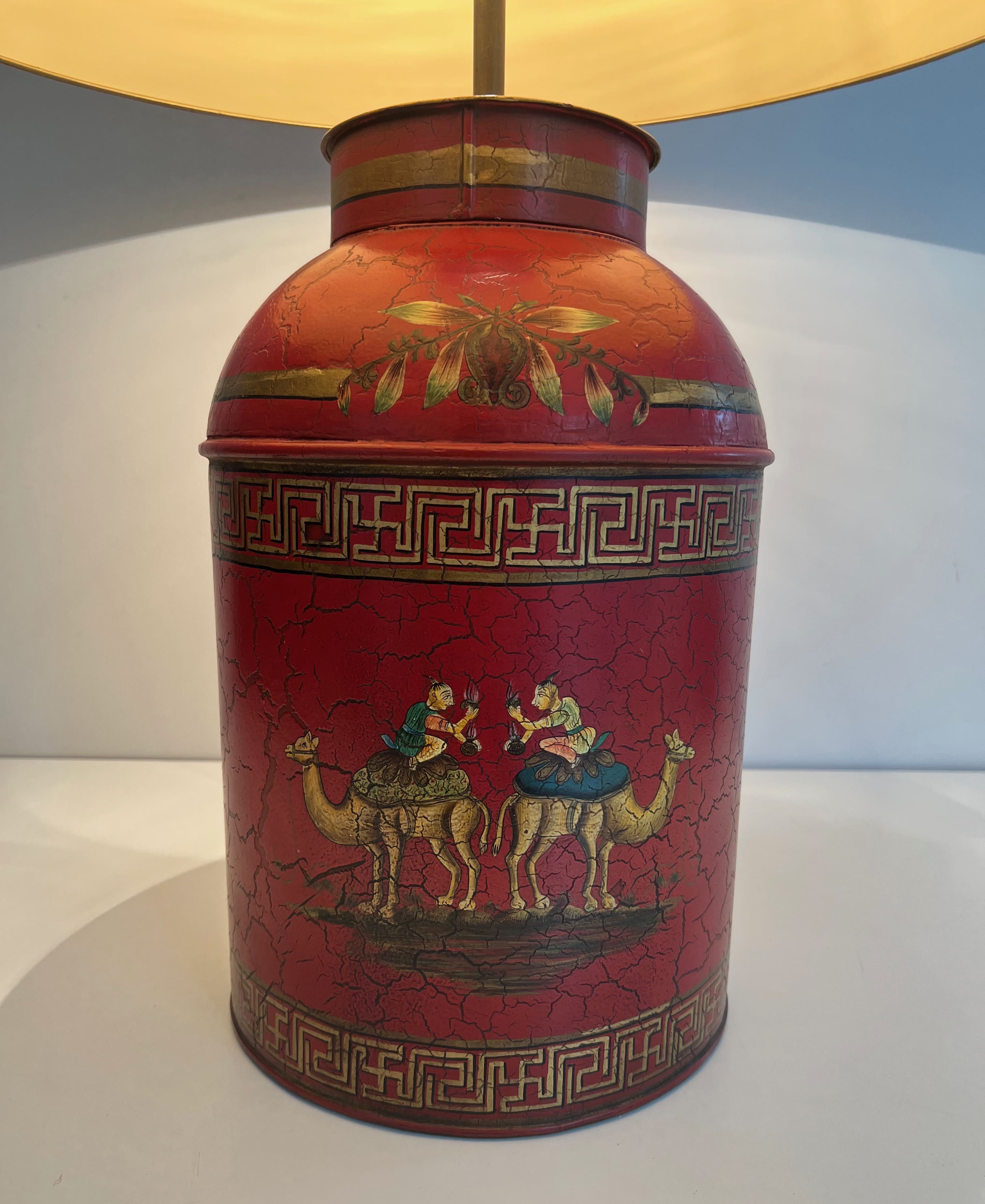 Ce luminaire repose sur le détournement élégant d'un objet utilitaire, une pratique classique de la haute décoration du XXe siècle. La base de la lampe est constituée d'une boîte cylindrique à épaulement courbe en tôle peinte, reprenant la typologie stricte des anciennes boîtes à thé servant à l'importation. La surface métallique est recouverte d'un fond rouge vif présentant un réseau de craquelures artificielles, une technique employée pour simuler l'ancienneté et l'aspect des laques asiatiques. Le corps est animé d'un décor de Chinoiseries peint à la main, figurant des personnages orientaux chevauchant des chameaux, encadré par de rigoureuses frises de grecques et surmonté de motifs floraux.
