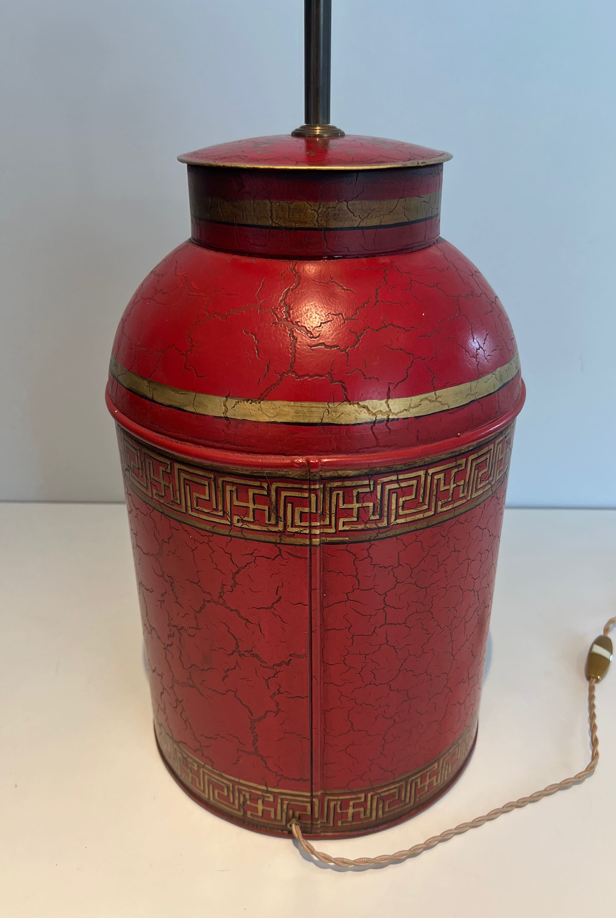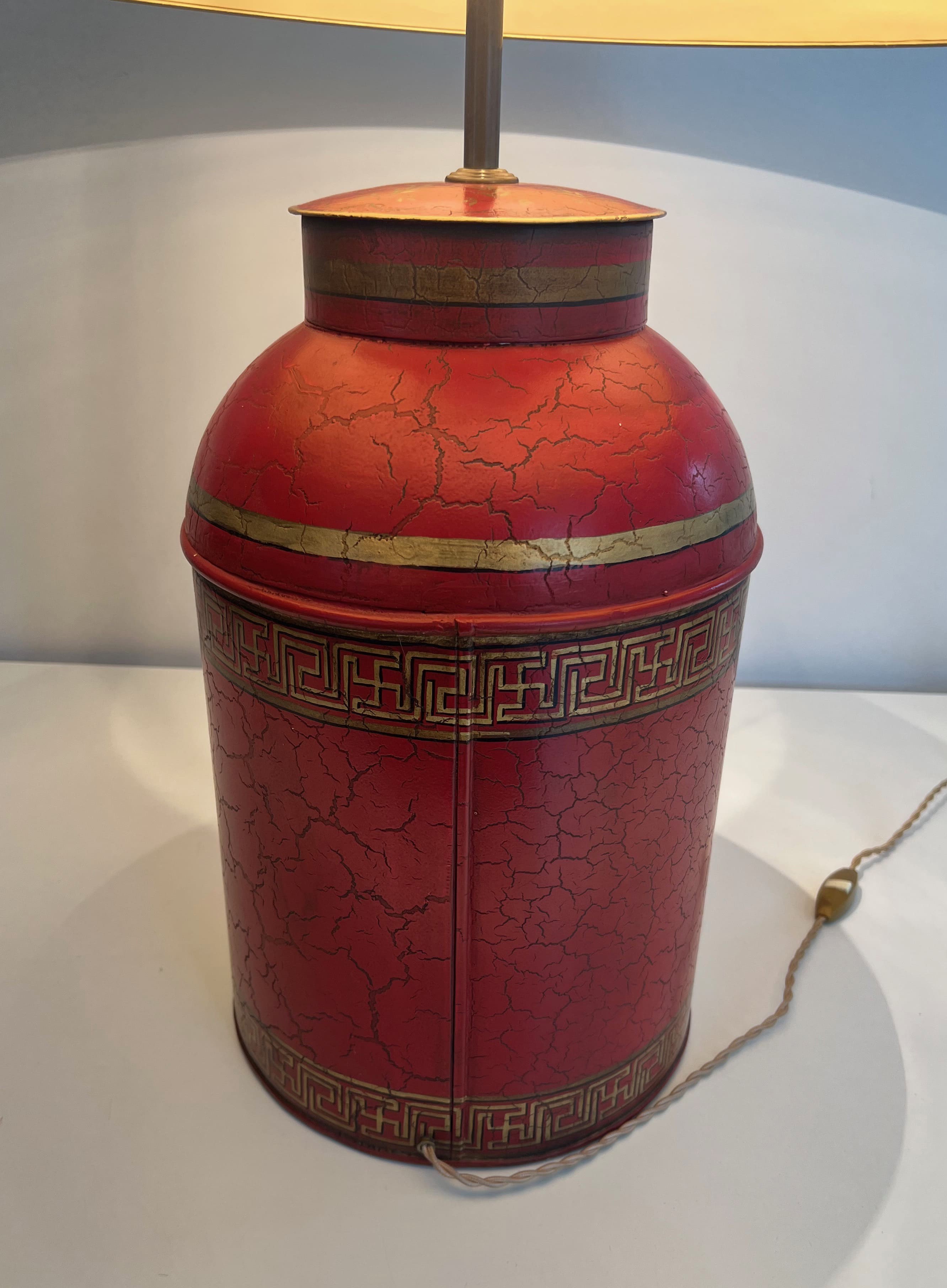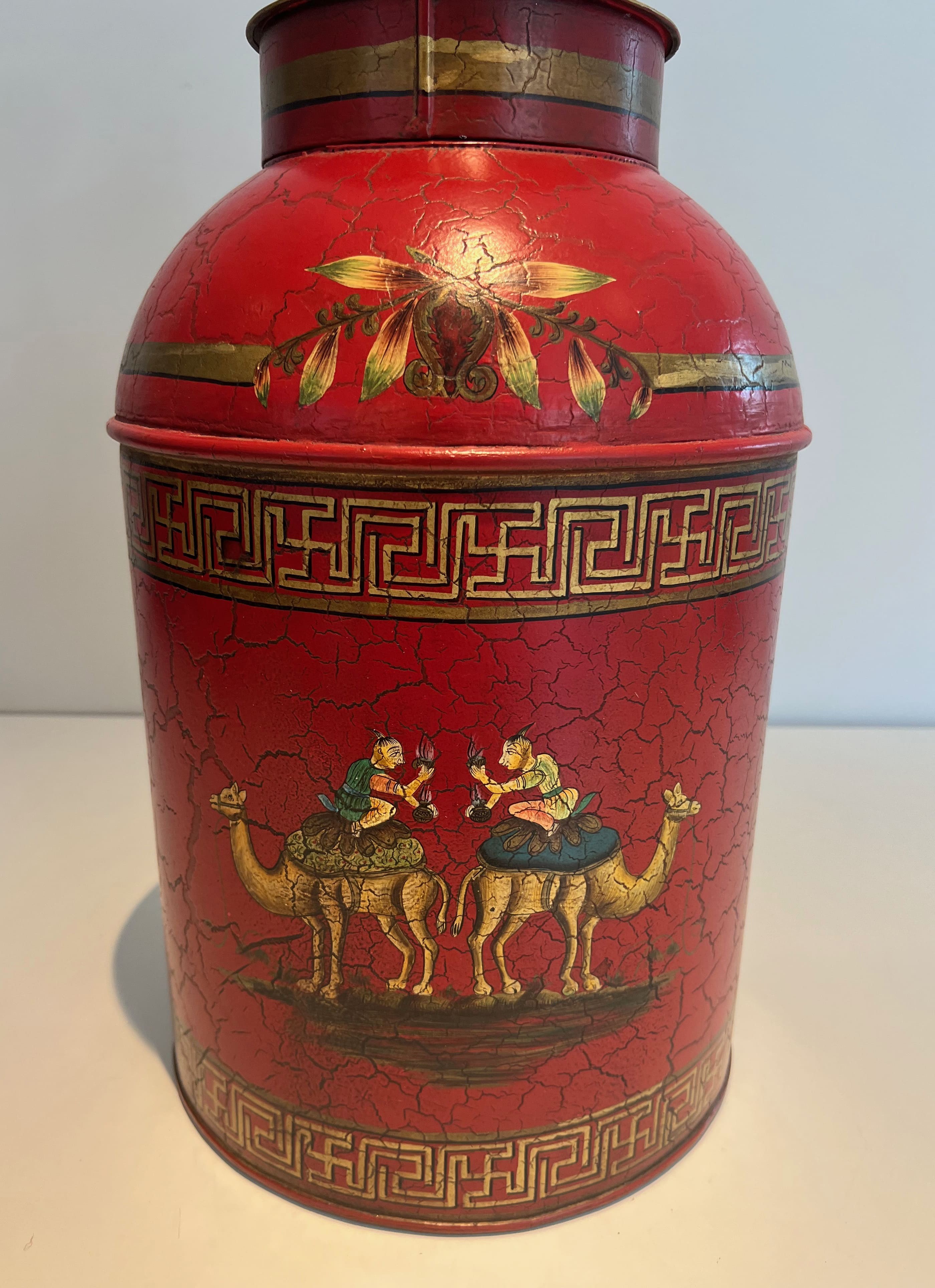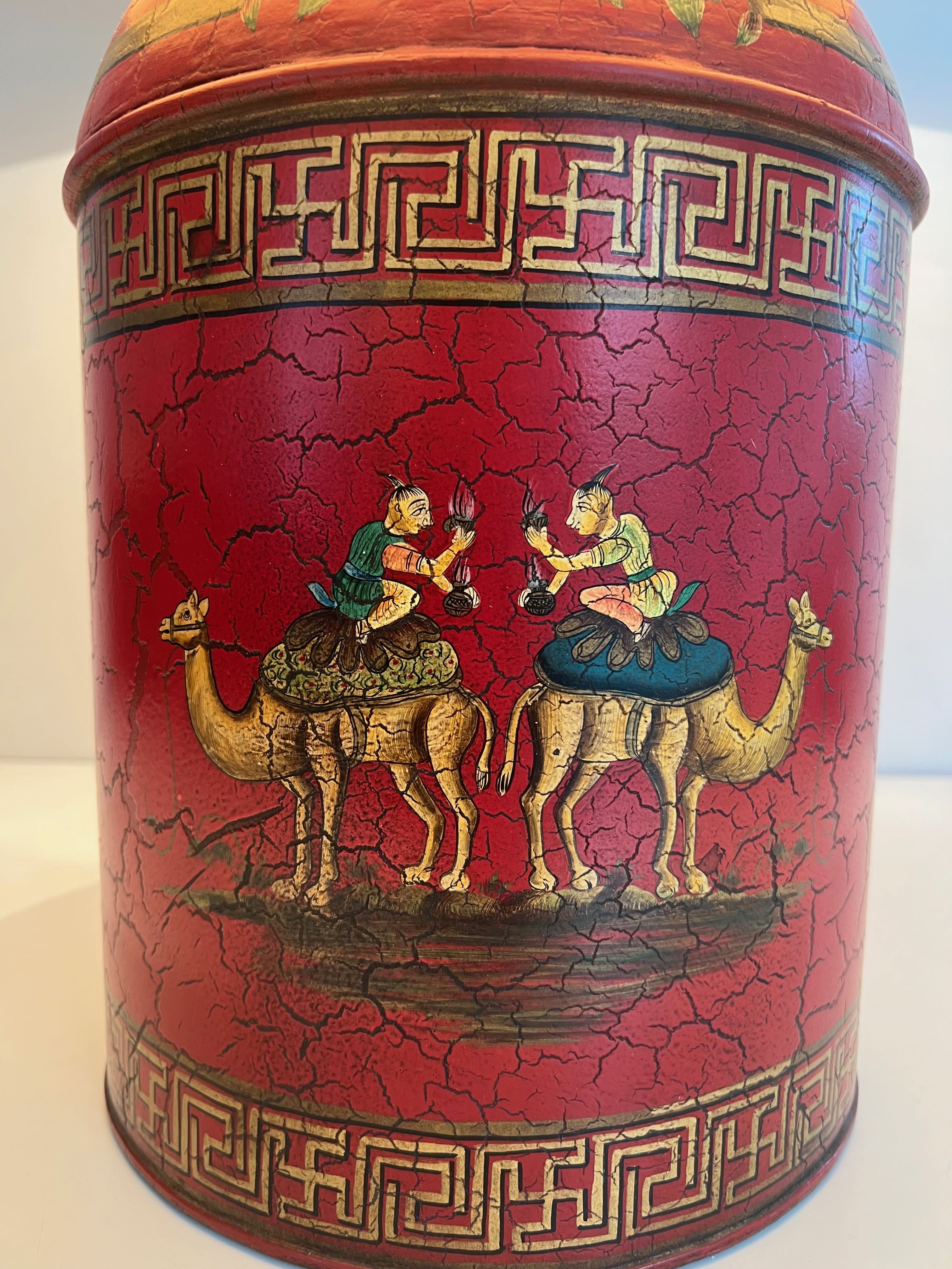 Ce luminaire repose sur le détournement élégant d'un objet utilitaire, une pratique classique de la haute décoration du XXe siècle. La base de la lampe est constituée d'une boîte cylindrique à épaulement courbe en tôle peinte, reprenant la typologie stricte des anciennes boîtes à thé servant à l'importation. La surface métallique est recouverte d'un fond rouge vif présentant un réseau de craquelures artificielles, une technique employée pour simuler l'ancienneté et l'aspect des laques asiatiques. Le corps est animé d'un décor de Chinoiseries peint à la main, figurant des personnages orientaux chevauchant des chameaux, encadré par de rigoureuses frises de grecques et surmonté de motifs floraux.