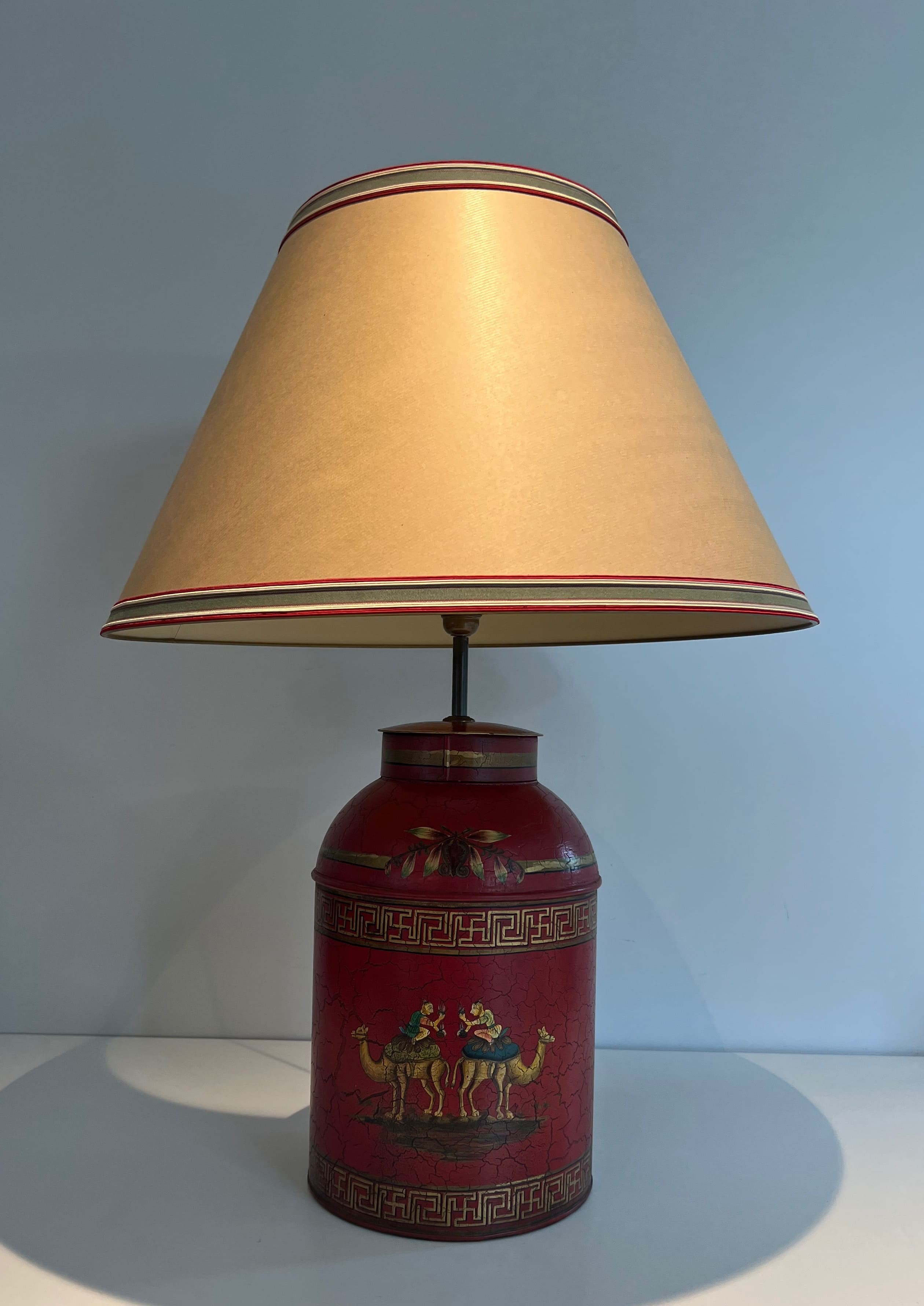 Lampe de table constituée d'une boîte cylindrique en tôle peinte (façon ancienne boîte à thé) montée en luminaire. Fond rouge à finition craquelée, orné d'un décor polychrome de Chinoiseries (chameliers et frises de grecques). Vendu avec son abat-jour conique souligné d'un galon tricolore. Dimensions : Diamètre de l'abat-jour : 54 cm | Hauteur totale : 81.5 cm.