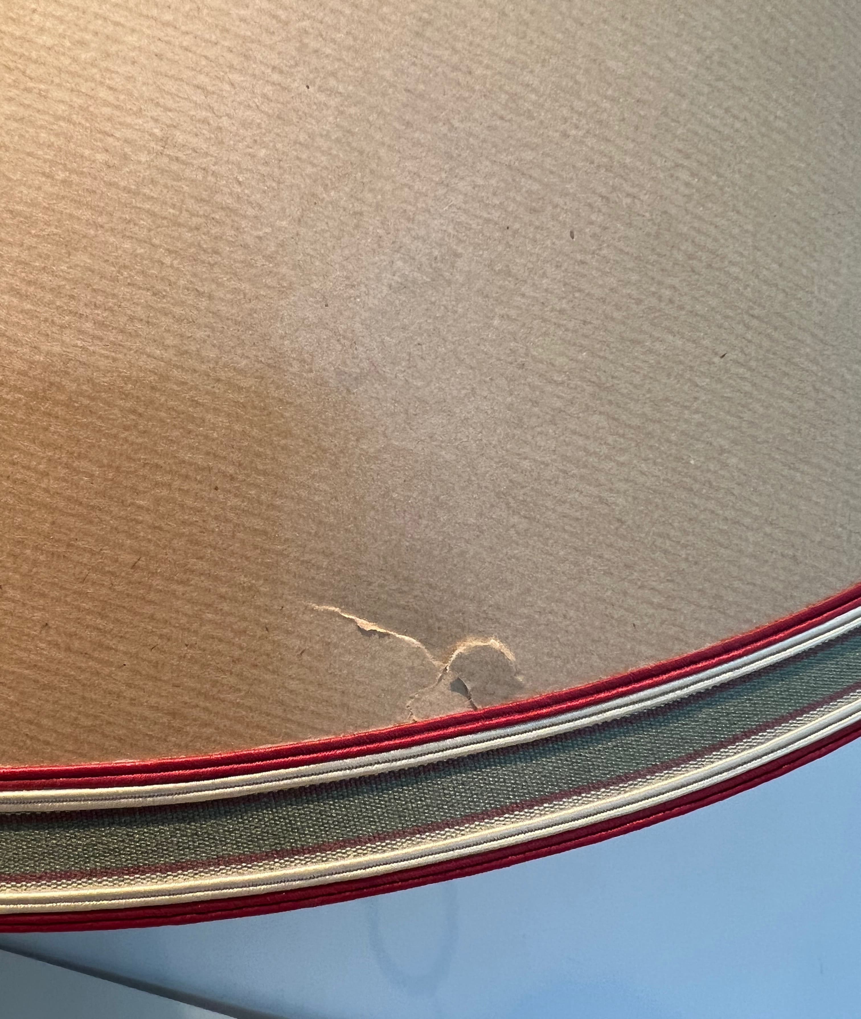 L'objet se présente en bon état général de conservation. L'usure de la couche picturale et l'effet craquelé font partie intégrante de la patine recherchée pour ce type d'objet. Le système d'éclairage est surmonté d'un grand abat-jour conique de coupe classique, subtilement gansé de soutaches reprenant les teintes de la base. Cette lampe structurera visuellement un bureau en acajou, une console d'entrée ou un bout de canapé classique.
