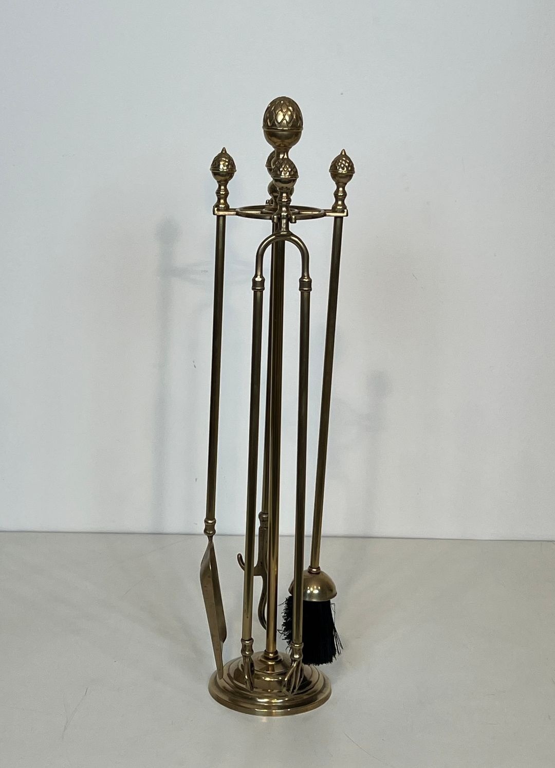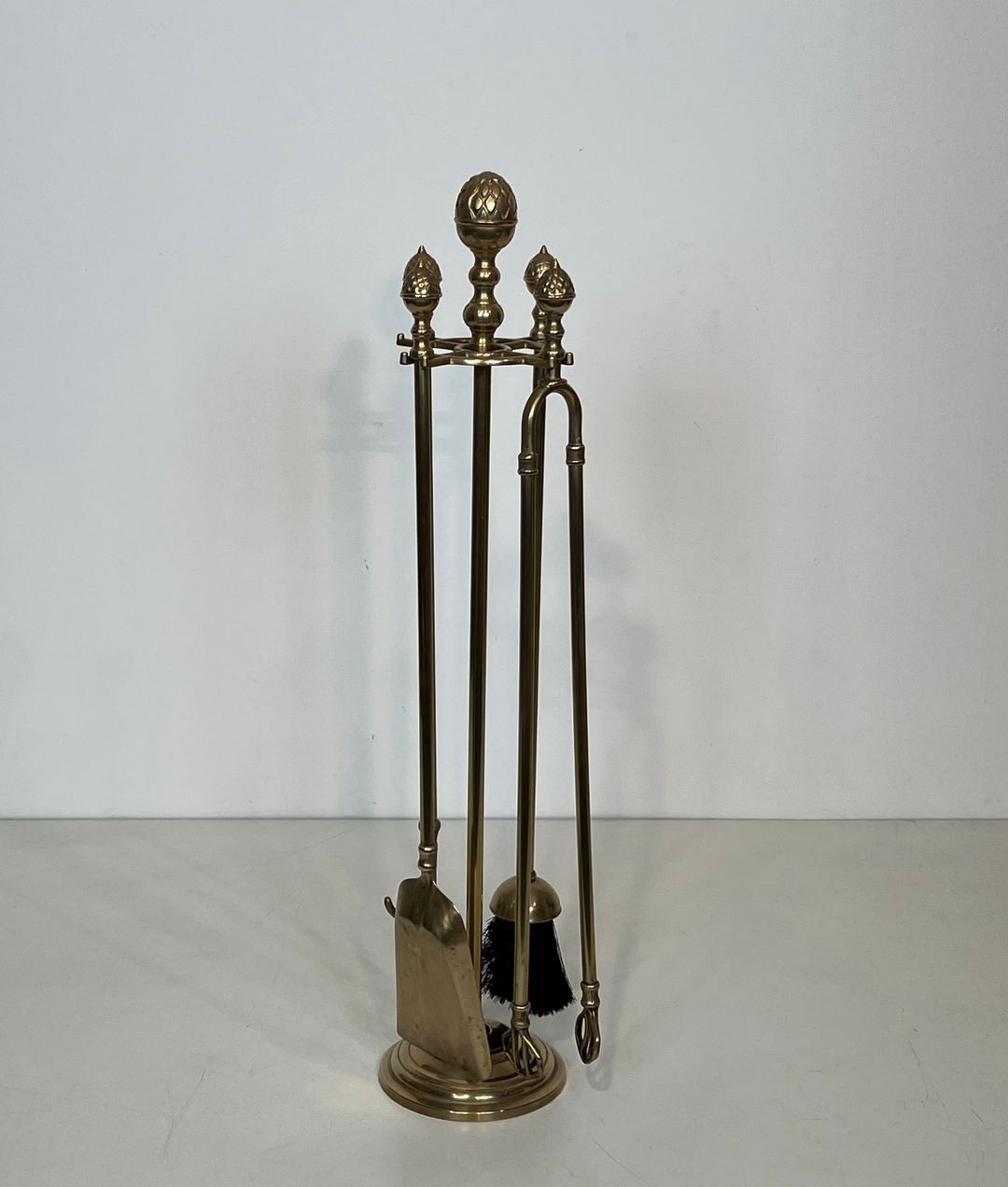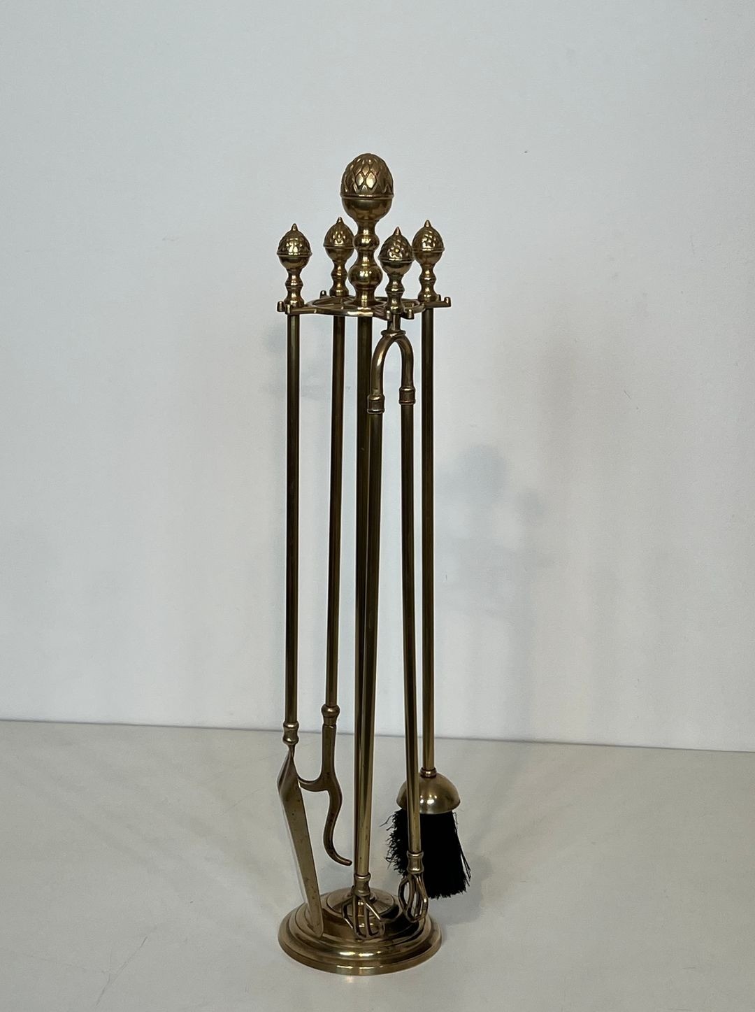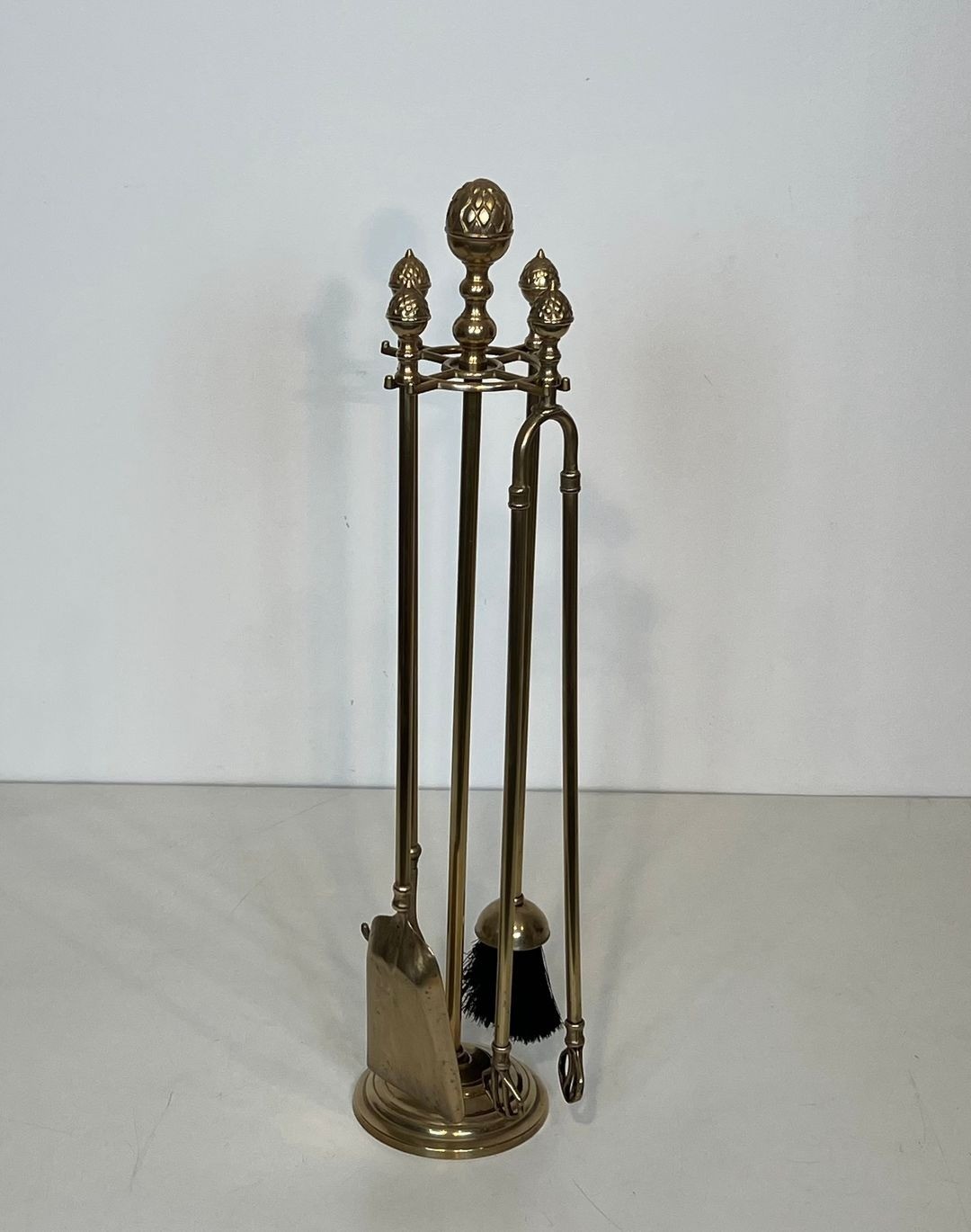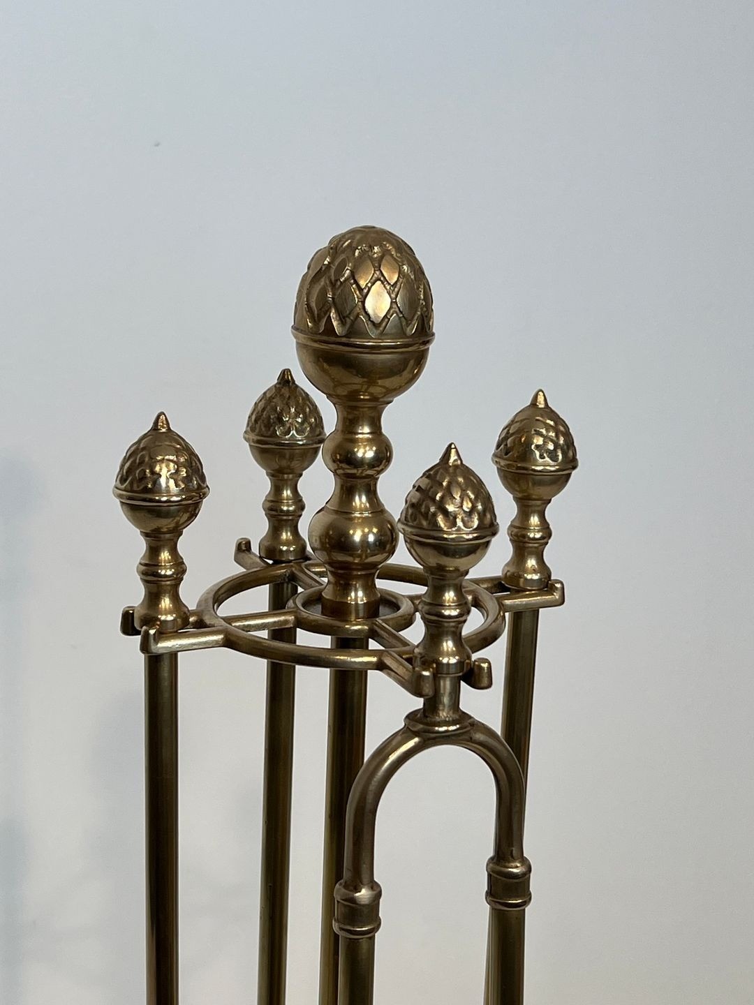 Nécessaire de Cheminée en Laiton aux Pommes de Pin, dans le Goût de la Maison Baguès, vers 1970