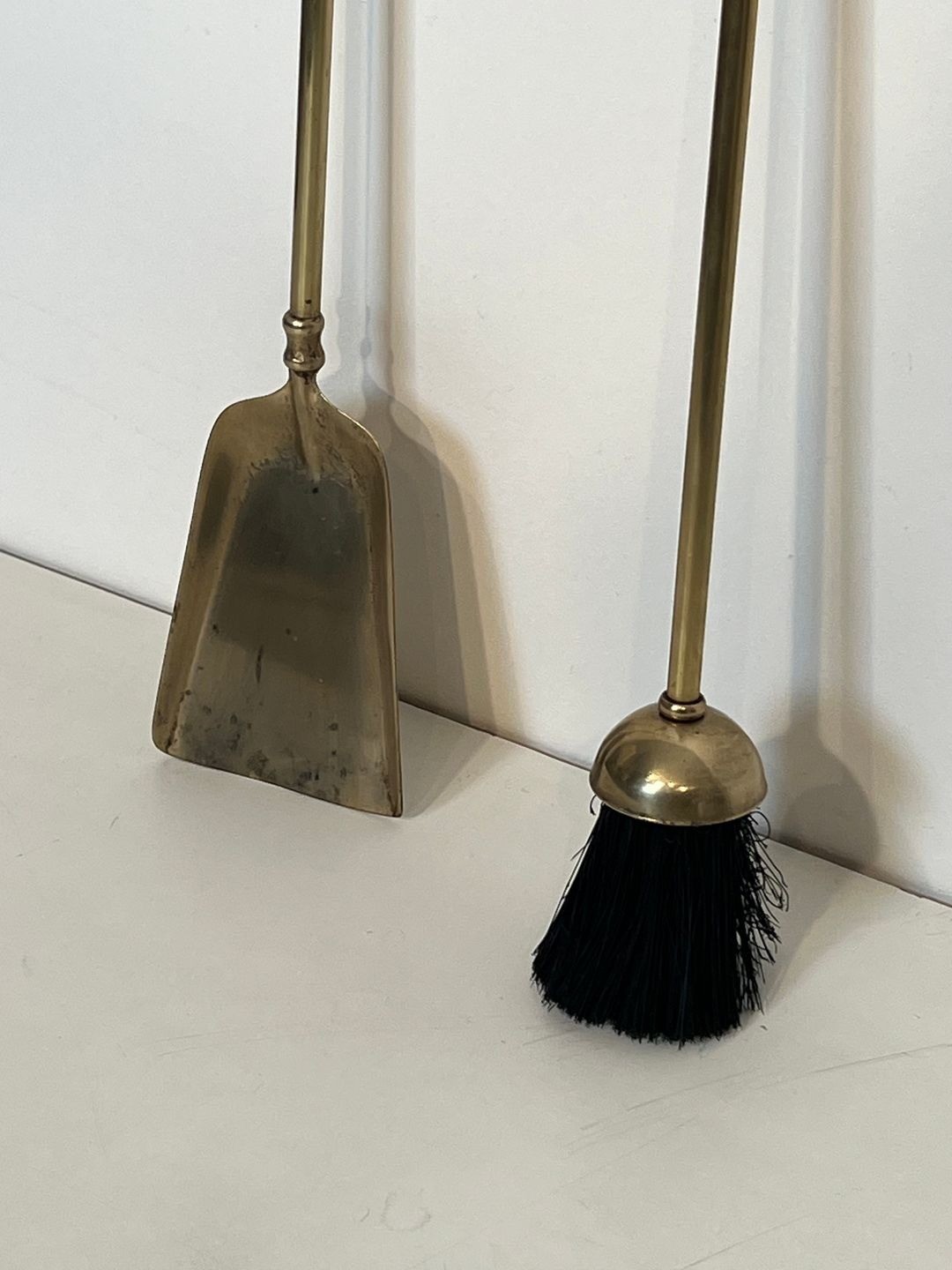 Nécessaire de cheminée en laiton néoclassique d’une élégance toute en verticalité, dans la manière distinguée de la Maison Baguès, comprenant un support et l’ensemble de ses outils, chaque manche couronner d’une pomme de pin finement fondue. Le support s’élève depuis une base circulaire, sa haute colonne élancée présentant les outils en disposition verticale qui attire le regard vers les pommes de pin rangées en couronnement—effet aussi sculptural que fonctionnel. La pomme de pin est fondue avec un soin minutieux pour les écailles superposées qui lui confèrent sa texture caractéristique, captant la chaleur ambiante du foyer dans la finition laiton laqué.