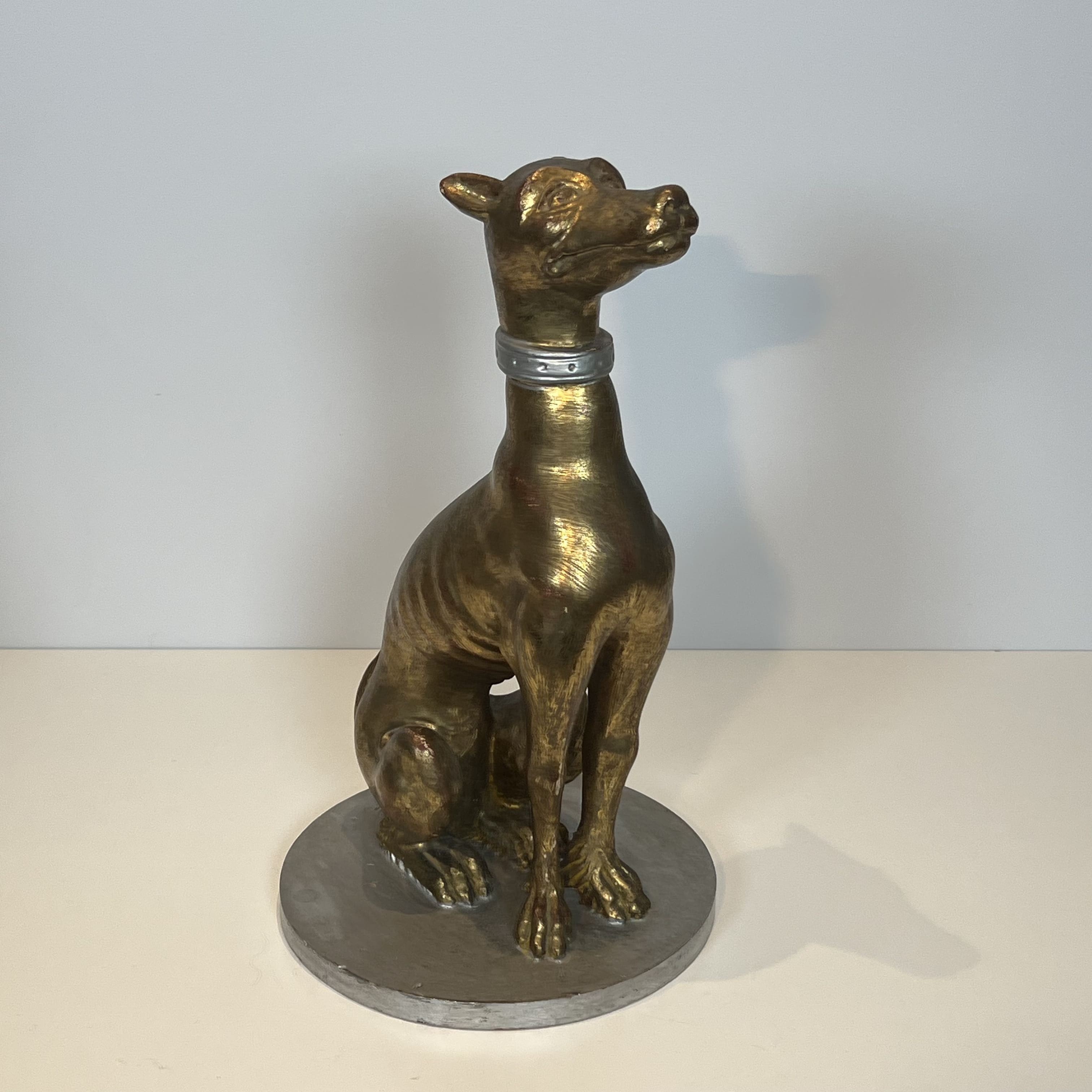 Sur le plan technique, l'œuvre illustre l'excellence des ateliers de dorure italiens du milieu du XXe siècle. Le bois est recouvert d'une dorure appliquée sur une assiette rouge (bol d'Arménie), créant un jeu de profondeur chaleureux. Les colliers et les bases présentent une finition argentée contrastant avec le corps de l'animal. Ce type de statuaire décorative de grand format s'inscrit dans le renouveau néoclassique et le courant Hollywood Regency. Le lévrier, symbole aristocratique par excellence, était alors couramment employé par les décorateurs pour orner les vastes halls d'entrée ou encadrer théâtralement une cheminée.