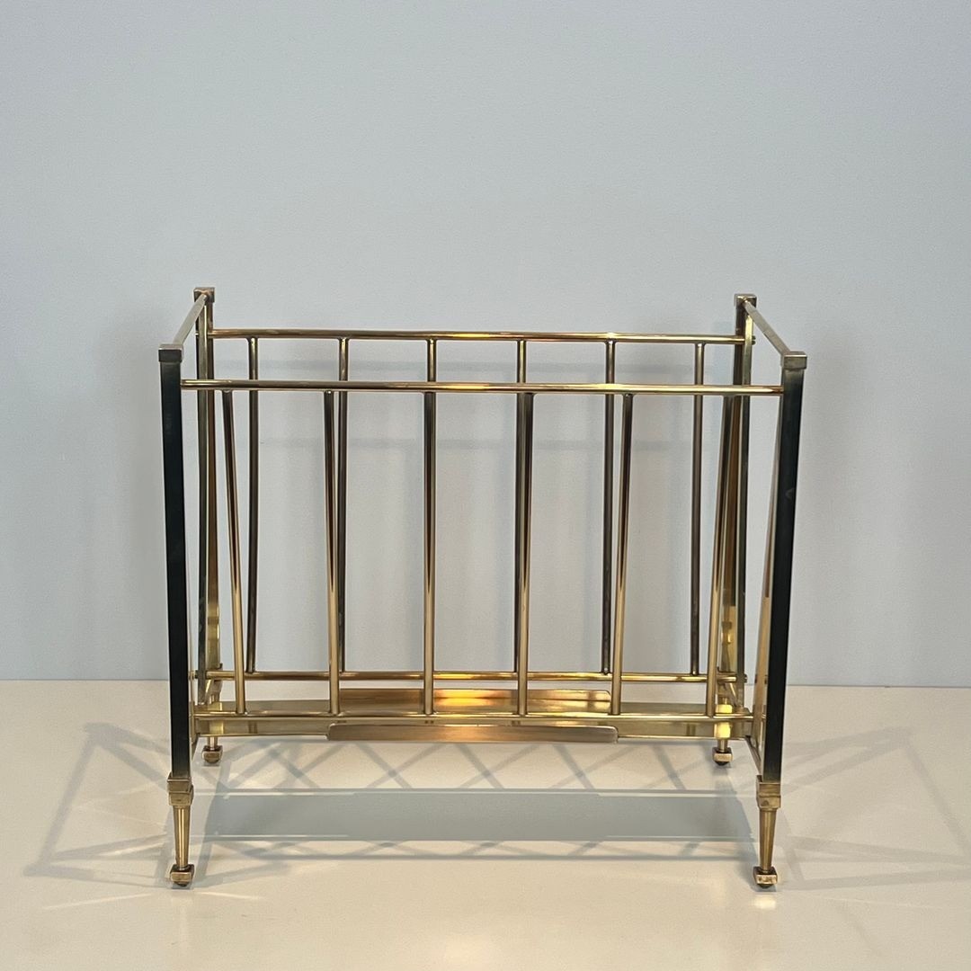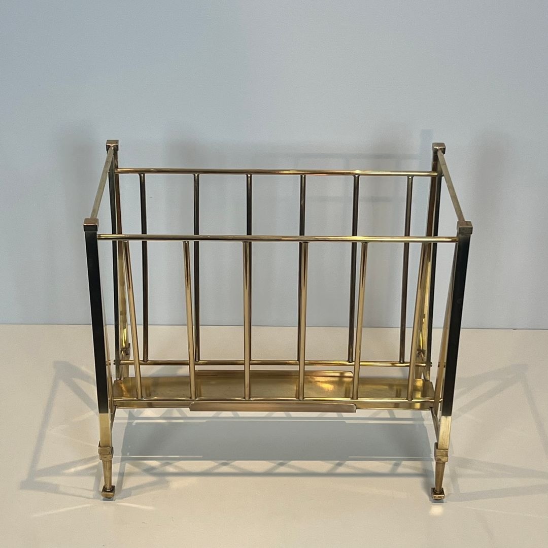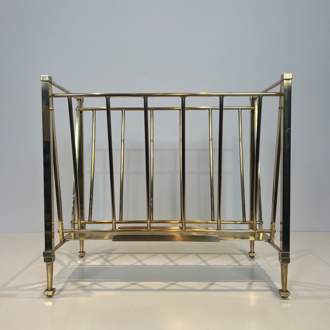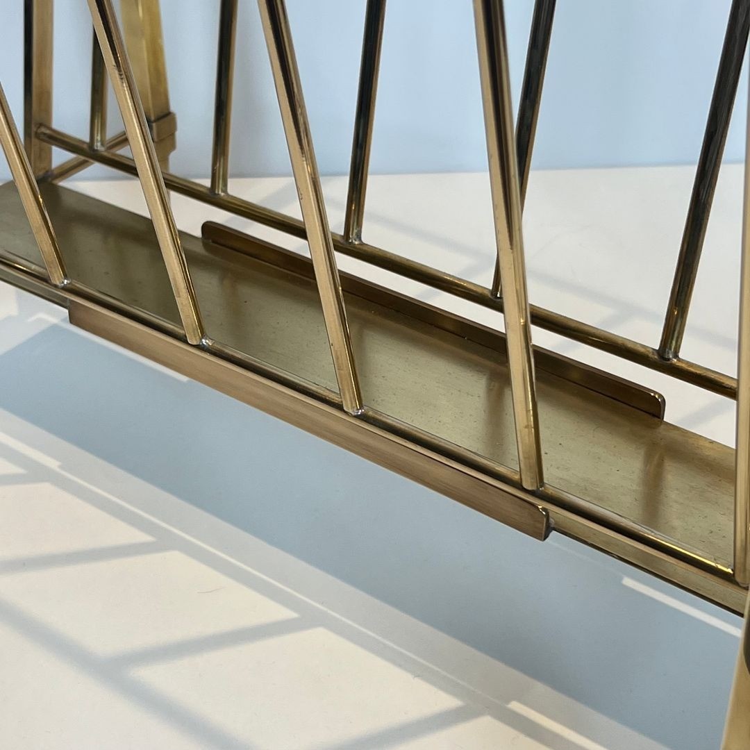La pièce se présente sous la forme d’un bâti ouvert en laiton, structuré pour maintenir debout journaux et périodiques dans un corps rectangulaire compact. Le vocabulaire néoclassique se lit dans la mesure des montants, le programme ornemental retenu et la clarté architecturale d’ensemble — autant de qualités caractéristiques de la production des ateliers parisiens de haut rang des années 1930 et du début des années 1940. Ses dimensions sont de 42 cm de large, 23,5 cm de profond et 37,5 cm de haut, un format propice à une installation au pied d’un fauteuil de lecture ou sur un guéridon.