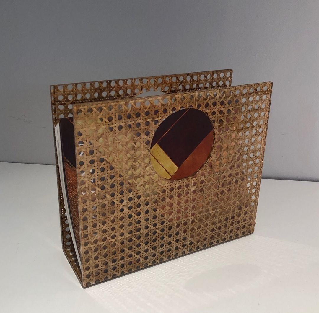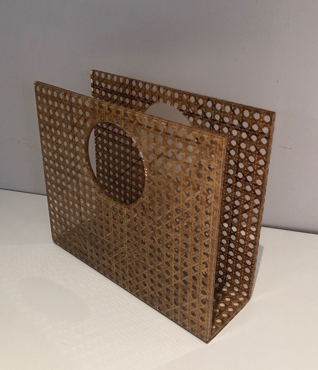 Dans le goût de Christian Dior et Gabriella Crespi. Porte-revues "sac à main" en plexiglass, laiton et cannage incrusté. Travail Français. Vers 1970