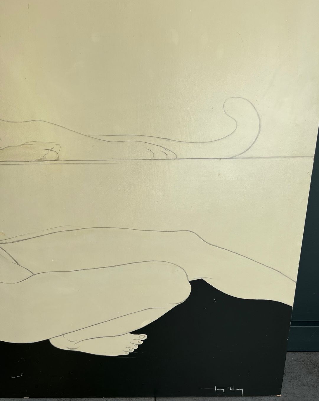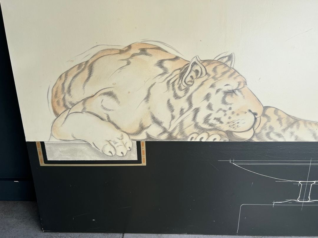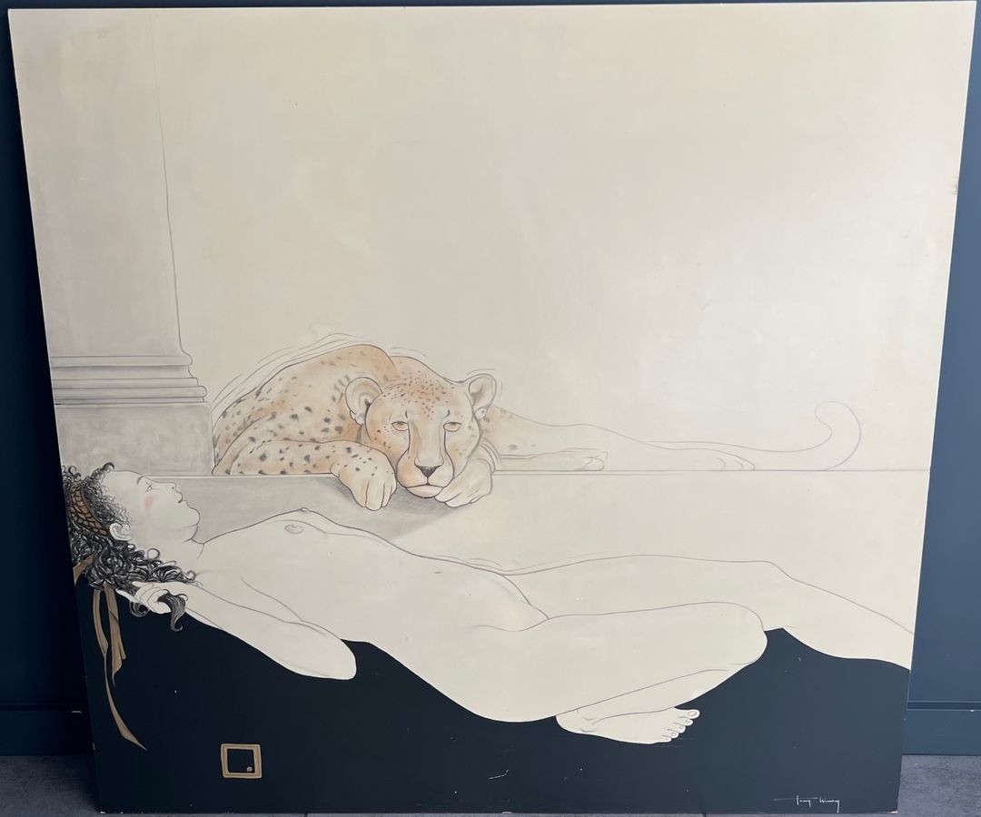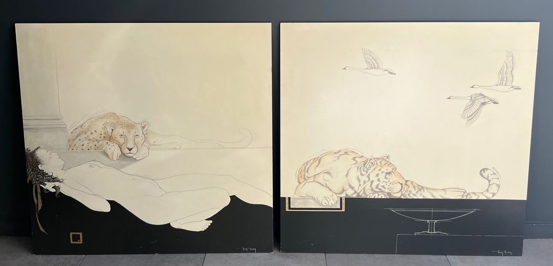 Paire de grandes gouaches représentant une femme nue allongée et un tigre sur l'une et un tigre et des oies sauvages sur l'autre. Les 2 gouaches sont signées Tony Warren. Vers 1980